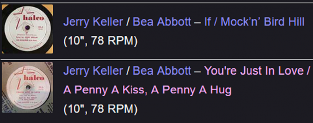 Wenn man die Schellacks aus dem Jahre 1951 hernimmt, wäre Jerry Keller erst etwa 14 Jahre bei dem Duett mit der um 12 Jahre äteren Bea Abbott gewesen - soferne die Daten halbwegs stimmen -, und das schien mir doch sehr eigenartig, insbesondere, weil es nirgendwo einen Hinweis auf ein Duett mit Bea Abbott und überhaupt auf den frühen Beginn von Jerry’s Karriere gibt. Meine Erhebungen laufen aber noch . . . . . . !