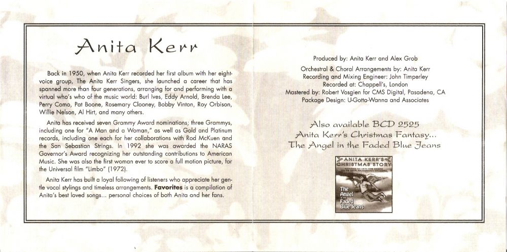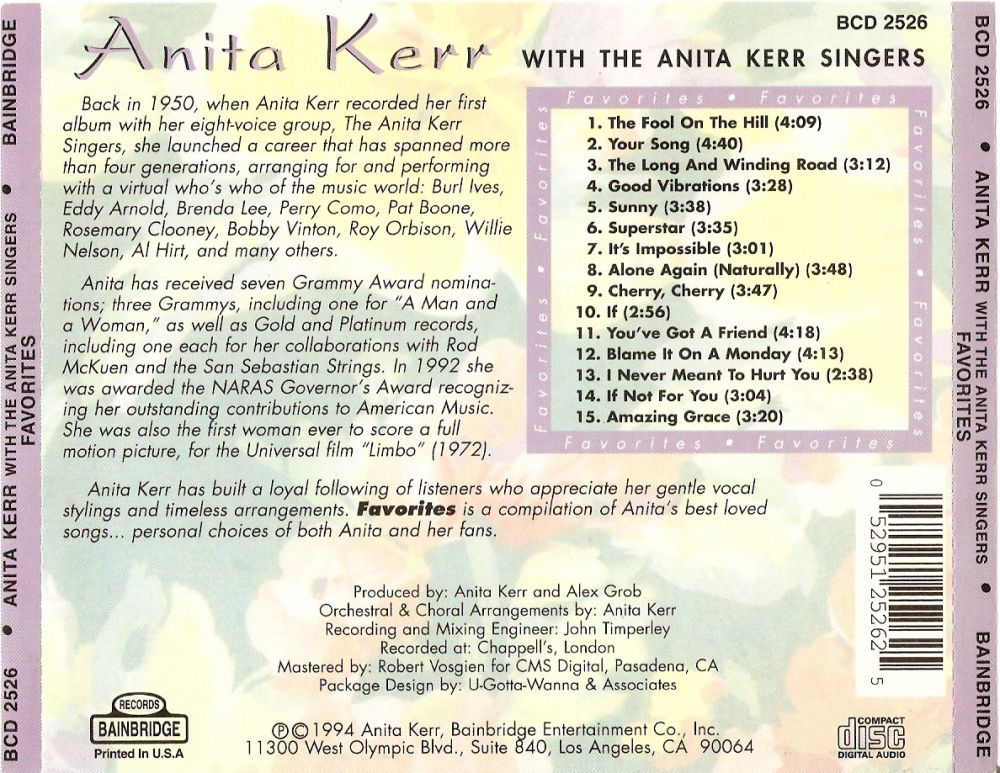 Die Sängerin, Pianistin, Komponistin, Arrangeurin und Produzentin Anita Kerr wurde am 13. Oktober 1927 in Memphis, Tennessee, als Anita Jean Grilli geboren und verstarb am 10. Oktober 2022 in Caraouge, Kanton Genf, Schweiz. 1947 heiratete sie den Deejay Al Kerr und das Ehepaar ging ein Jahr darauf nach Nashville. Die Ehe hielt bis etwa Anfang der Sechziger. Etwa 1965 ging sie eine zweite Ehe mit dem Schweizer Alex Grob ein, der ihr Manager wurde und mit dem sie und ihren zwei Töchtern aus erster Ehe vorerst nach Los Angeles ging und 1970 in die Schweiz zog.