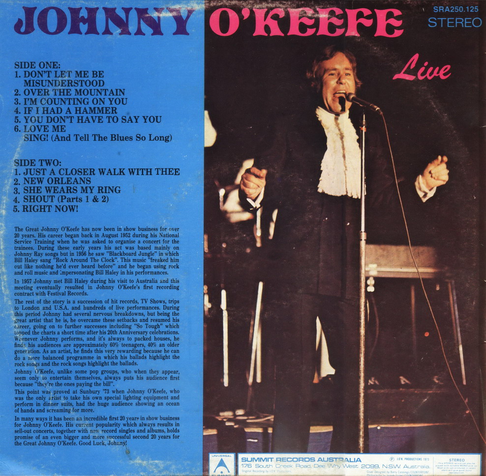 Following hit after hit in Australia JO’K finished with “Six O’Clock Rock” and in 1961 moved to Channel 7 as compere of “The Johnny O’Keefe Show” which was a major success. In 1963 the 7 Network renamed John’s show “Sing, Sing, Sing” and the success continued.