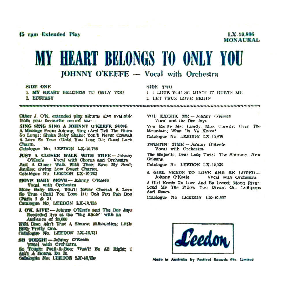 By 1957 Johnny O’Keefe and The Dee Jays had signed with Festival Records, released their first single “Billygoat (you hit the wrong note)” and were installed as the featured support act for Lee Gordon’s “Big Show” concerts which were headlined by American greats including Little Richard, Jerry Lee Lewis, Chuck Berry, Buddy Holly and The Everly Brothers. The Dee Jays were often the backing band for these artists.