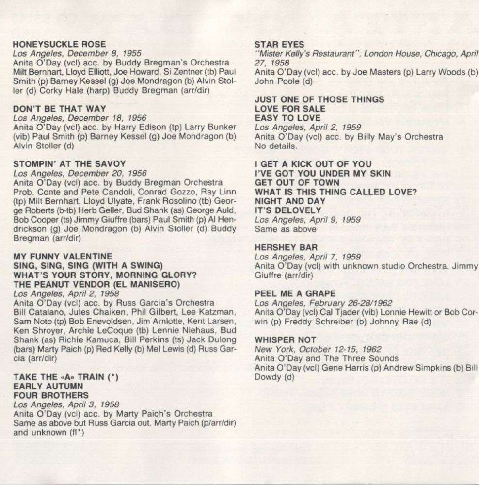 Disc One: 1. Lover Come Back To Me (A) 2:24 (S. Romberg-O. Hammerstein II) 2. Lullaby Of The Leaves (A) 3:06 (B. Petkere-J. Young) 3. Rock and Roll Blues (A) 3:15 (Anita O'Day) 4. Love For Sale (A) 3:33 (Cole Porter) 5. No Soap, No Hope Blues (B) 2:31 (R. Adler-J. Ross) 6. Speak Low (B) 2:35 (K. Weill-O. Nash) 7. The Lady Is A Tramp (B) 2:37 (R. Rodgers-L. Hart) 8. Strawberry Moon (B) 3:06 (S. Mysels-B. Hilliard) 9. Pagan Love Song © 2:37 (N.H. Brown-A. Freed) 10. Ain't This A Wonderful Day © 2:38 (Brooks-Clark) 11. Somebody's Cryin' © 2:58 (Pepper-James-Russell) 12. Vaya Con Dios © 3:37 (Pepper-James-Russell) 13. The Gypsy In My Soul (D) 2:31 (C. Boland-M. Jaffe) 14. Just One Of Those Things (D) 2:38 (Cole Porter) 15. The Man I Love (D) 4:10 (G. Gershwin-I. Gershwin) 16. Frankie and Johnny (D) 3:34 (B. Leighton-B. Bunch) 17. Anita's Blues (E) 3:23 (Anita O'Day) 18. I Cover The Waterfront (E) 3:43 (J. Green-E. Heyman) 19. I Didn't Know What Time It Was (E) 3:40 (R. Rodgers-L. Hart) 20. Let's Fall In Love (E) 2:23 (H. Arlen-T. Koehler) 21. You're Getting To Be A Habit With Me (F) 2:42 (H. Warren-A. Dubin) 22. From This Moment On (F) 3:09 (Cole Porter) 23. You Don't Know What Love Is (F) 2:54 (D. Raye-G. DePaul) 24. Medley::There Will Never Be Another You (F) 3:12 (H. Warren-M.Gordon) Just Friends (S. Lewis-J. Klenner)