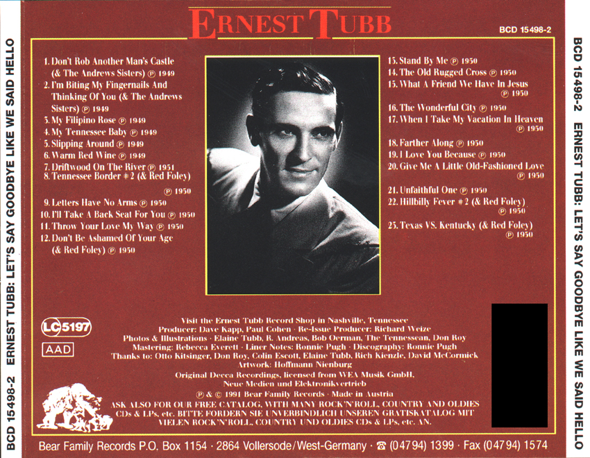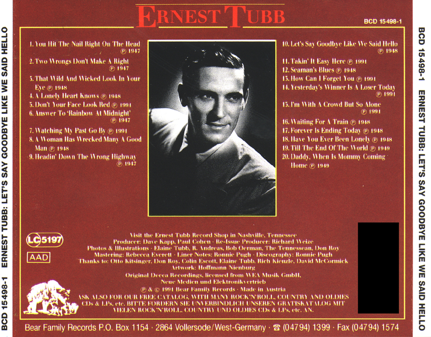 17 January 1944 Decca Recording Studio, 5505 Melrose Ave., Hollywood, CA - Ernest Tubb (Jimmie Short [gt], Leon Short [rh gt], Butterball Paige [bass], Johnny Sapp [fiddle]. Producer: Joe Perry)