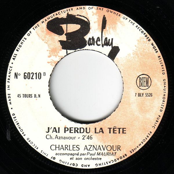 ?? 60….Nº 60210 A….CHARLES AZNAVOUR accompagné par Paul MAURIAT et son orchestre..Tu t’laisse aller (7 BLY 5511)/ B….J'ai perdu la tête (7 BLY 5526)