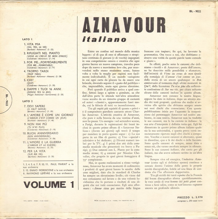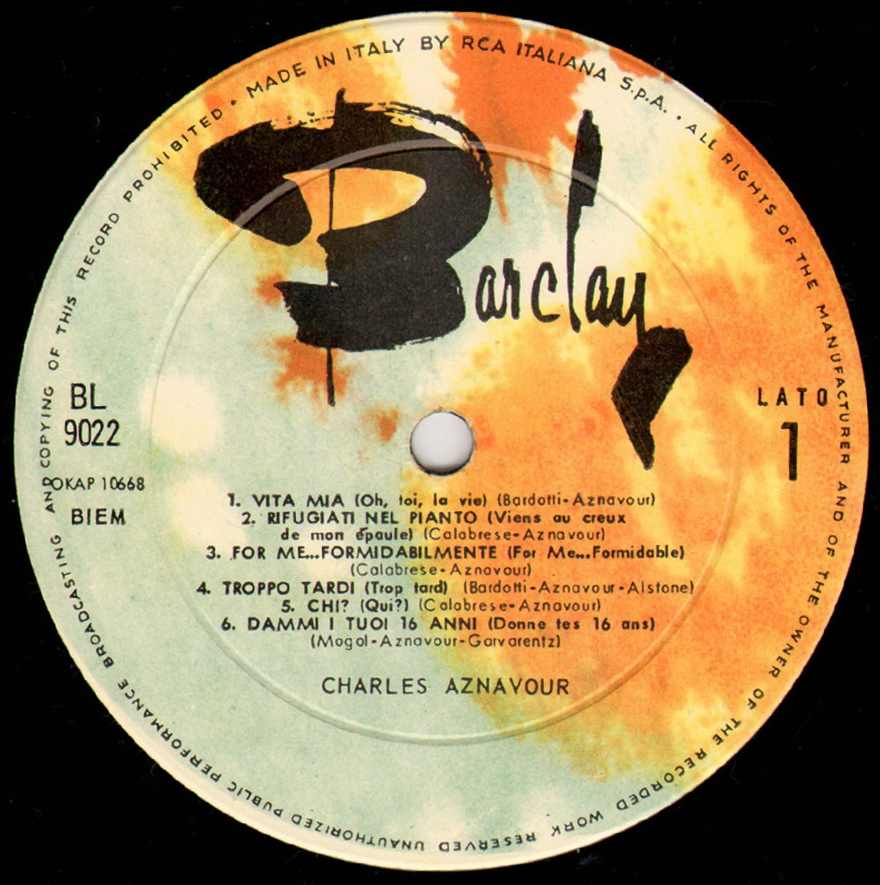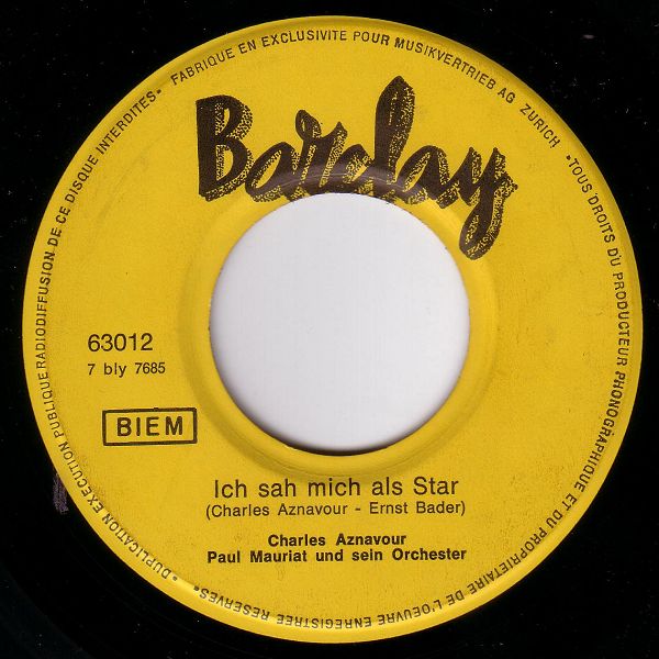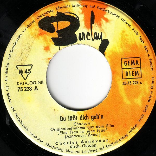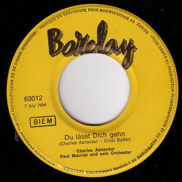 Als den bekanntesten Song von Charles Aznavour in der zu Ende gehenden Rocknroll-Ära würde ich "Du läßt dich geh'n" ansehen, wobei die B-Seite für die Platten-Bosse offensichtlich nur ein Lückenbüsser war, wie man an der unterschiedlichen Auswahl für den schweizerisch-österreichischen bzw. für den deutschen Markt sieht. Interessant ist auch der Umstand, dass viele glauben, dieser Titel ist ausschließlich für die deutschsprachigen Konsumenten geschrieben worden. Diesen Eindruck hatte ich jedenfalls bei Gesprächen mit Freunden, Bekannten etc. Es gibt aber ein französischsprachiges Original, welches auch bei uns in Österreich zu haben war. Trotzdem war "Tu t’laisse aller" auf Charles' erster BARCLAY-Single bei uns so gut wie unbekannt, was vermutlich zu diesem falschen Eindruck führte.