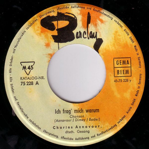 03 62....75 228 A….Charles Aznavour, dtsch. Gesang..Du läßt dich geh'n (steht nicht auf Platte: Tu t’laisses aller)/Ich frag' mich warum (steht nicht auf Platte: L’amour et la guerre)