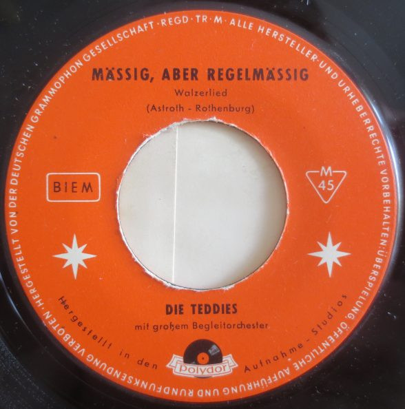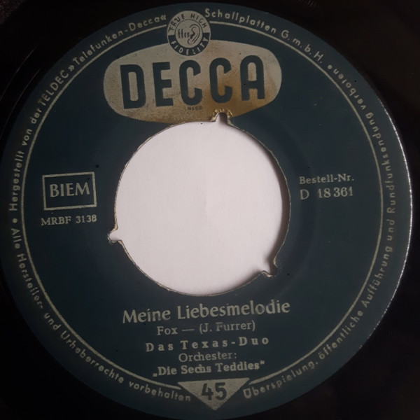 Laut Discogs gab es die erste Single der sechs Teddies auf DECCA und dieser Hinweis scheint mir sehr plausibel. Da ich aber für deutsche Schlager alles andere als ein Experte bin möchte ich gerne Heino fragen: Hat Discogs recht oder handelt es sich um ein anderes Sextett?
