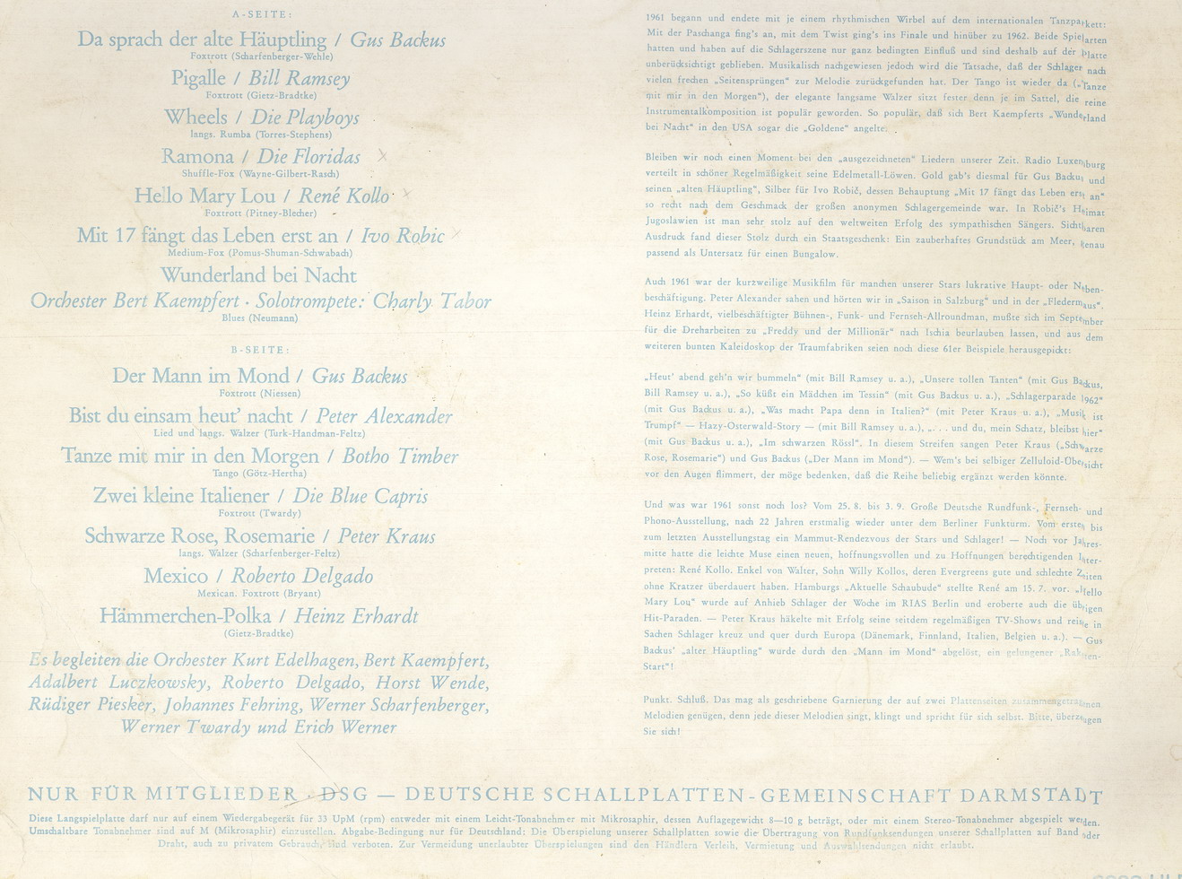 Habe gerade festgestellt, daß ich einige der neueren Beiträge hier noch nicht gesehen hatte... interessant die Werbeplatte der Deutschen Buch-Gemeinschaft: offensichtlich jünger als die "Atlas"-Platten, nicht mehr nur Polydor/DGG-Repertoire (Philips, Vogue und Electrola sind dabei), und die Schallplatten-Gemeinschaft wurde mit der Buchgemeinschaft zusammengelegt...