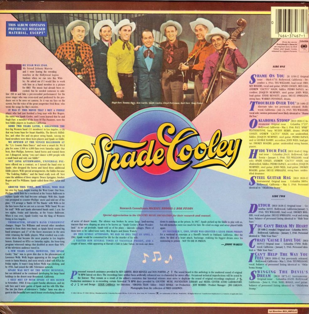 Cooley begann seine Karriere als Musiker erst 1941, als er als Mitglied von Cal Shrums Band ins Studio ging. Ein Jahr später übernahm er die Leitung der Gruppe von Bandleader Jimmy Wakely, der Hausband des Venice Pier Ballroom in Santa Monica, Kalifornien, und ihre Western-Swing-Musik zog jeden Samstagabend Tausende von Fans an. Die dicht besetzte Band, in der zeitweise bis zu drei Sänger und Fiddler spielten, bestand aus Sänger Tex Williams und den Gitarristen Joaquin Murphey und John O. Weis. 1945 hielt sich Spade Cooley & His Orchestras erste Single „Shame on You“ neun Wochen lang an der Spitze der Billboard Country-Charts. Als erste von sechs aufeinanderfolgenden Top-Ten-Singles (darunter „Detour“ und „You Can't Break My Heart“) sollte „Shame on You“ für viele Jahre Cooleys Erkennungsmelodie bleiben.
