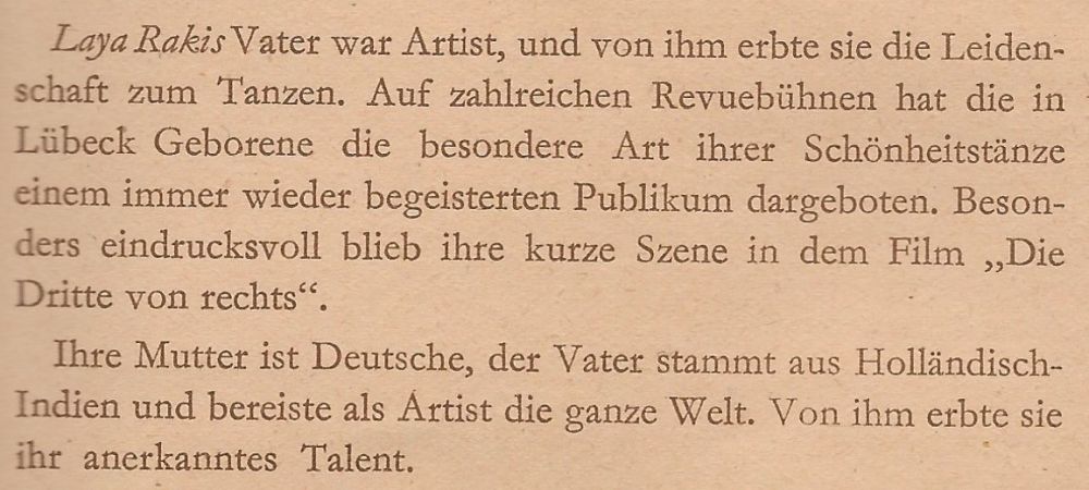 LAYA RAKI, eigentlich Brunhilde Marie Alma Herta Jörns, wurde am 27. Juli 1927