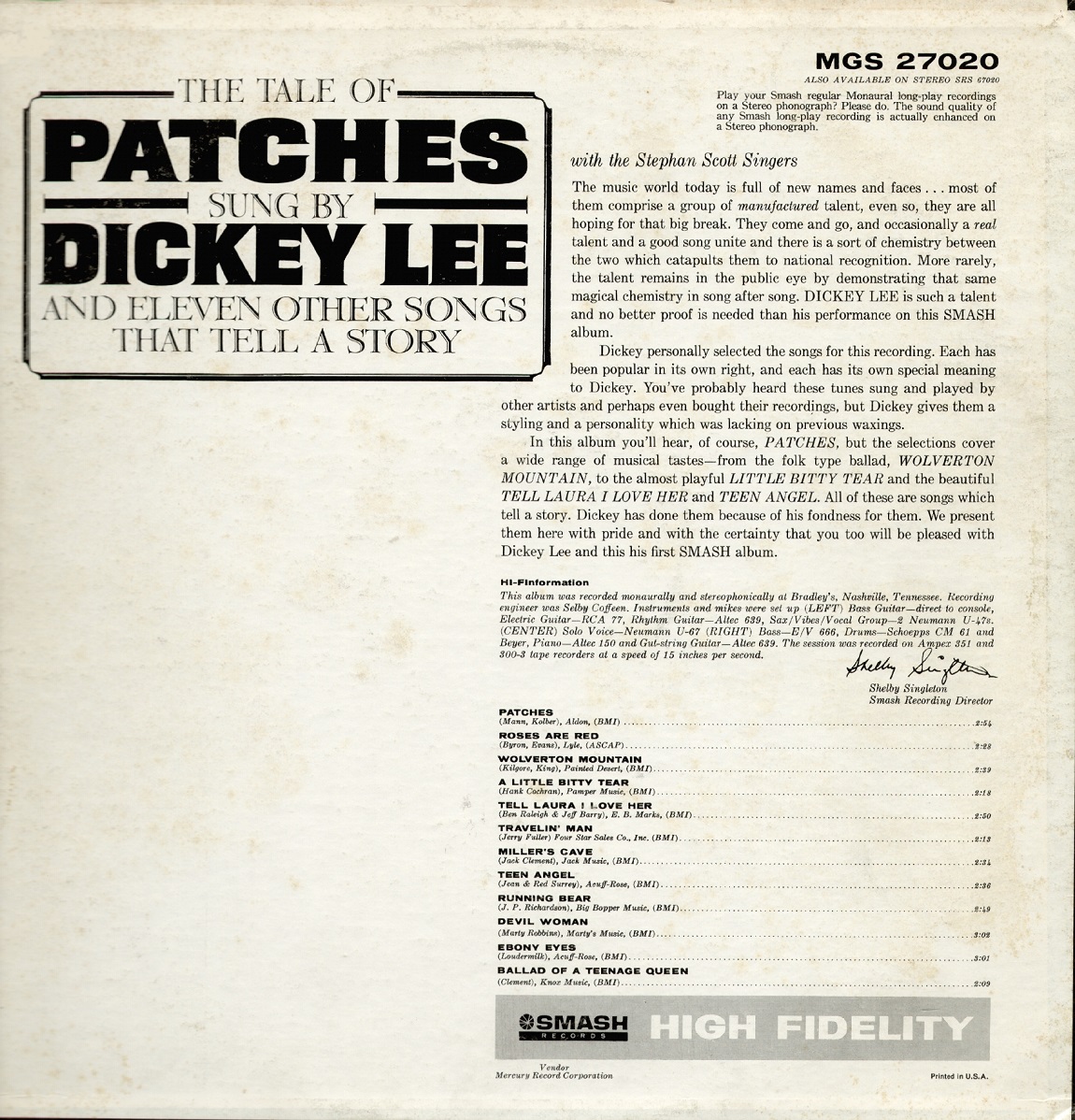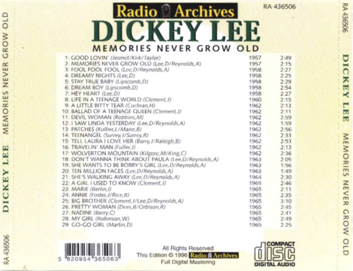 Der Sänger, Songwriter und Gitarrist Dickey Lee wurde am 21. September 1936 in Memphis, Tennessee, als Royden Dickey Lipscomb geboren.