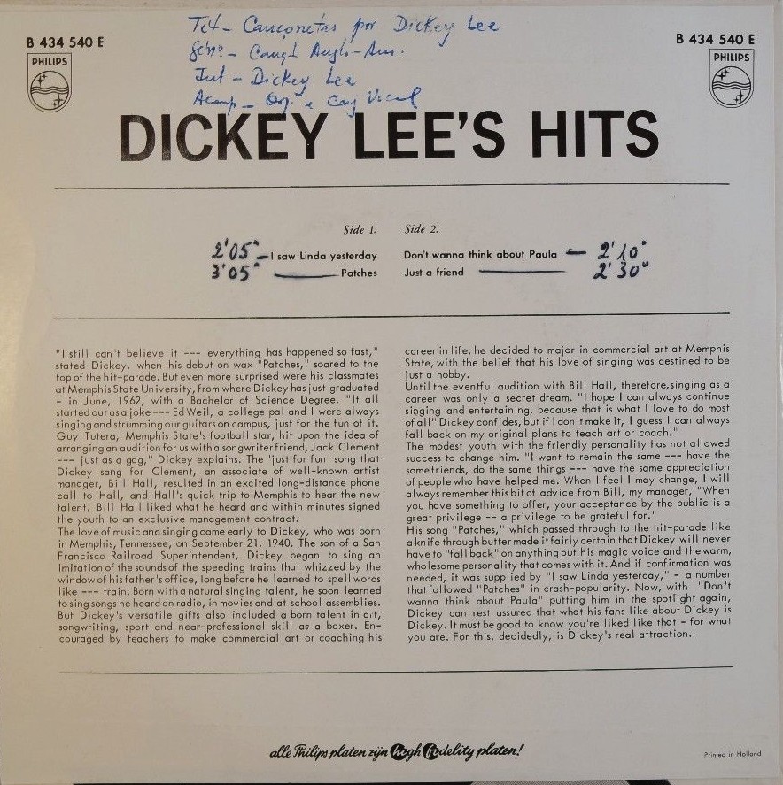 Für Liebhaber gehobener Schlagermusik gab es noch einen populären Sänger mit sehr ähnlichem Namen, nämlich Dick Lee, über den man hier Einiges erfahren kann (links klicken).