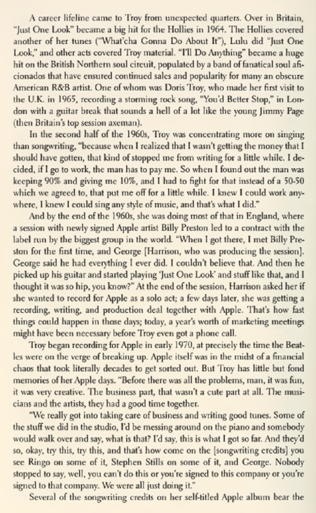 Aber ihre Siegesserie war schnell vorbei, und als das Interesse an Amerika nachließ, fing Troy an, Großbritannien öfter zu besuchen, wo eine Coverversion von „Just One Look“ von The Hollies dazu beigetragen hatte, ihr Profil zu schärfen. Bei ihren Live-Shows wurde sie oft von dem jungen Elton John (damals noch bekannt als Reg Dwight) am Klavier unterstützt, und „I’ll Do Anything (He Wants Me To Do)“ wurde zu einem festen Bestandteil des nördlichen Souls.