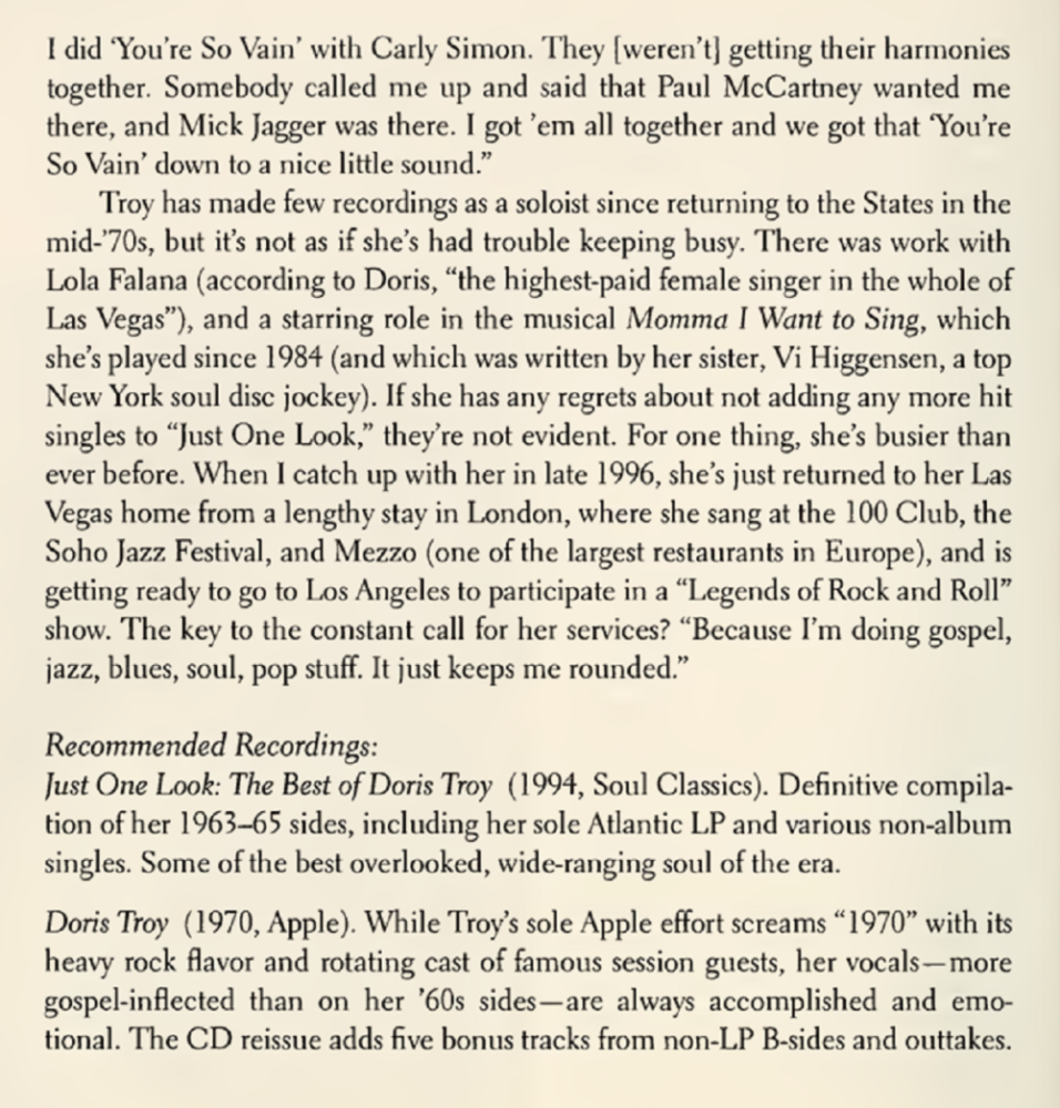 Vain“ und wirkte sowohl als Autor als auch als Sänger auf Billy Prestons Album „That’s The Way God Planned It“ für Apple mit. Auf ihrem Album „Doris Troy“ war sie von einer außergewöhnlichen Galaxie von Talenten umgeben, darunter Stephen Stills, Peter Frampton, Eric Clapton und Ringo Starr, aber die Verkaufszahlen waren enttäuschend.