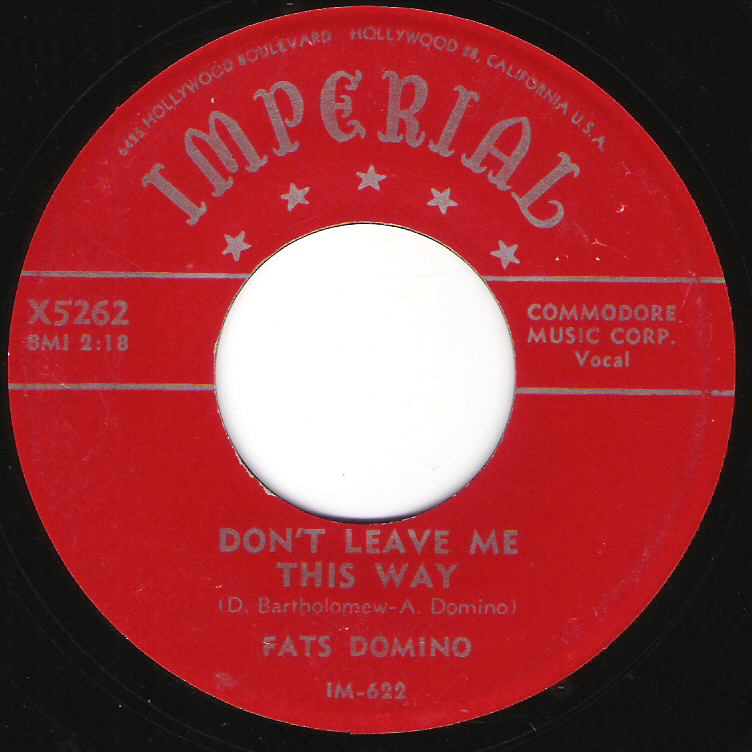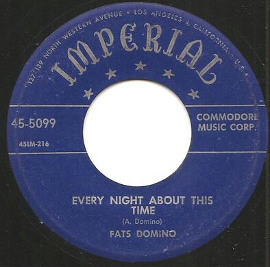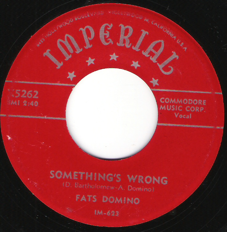 Wenn eine Firma sein Logo mehrmals veränderte war es bei sehr populären Interpreten ziemlich schwer, hier etwas Ordnung reinzubringen. Fats Domino gehörte bei IMPERIAL natürlich zu den populärsten Interpreten was zur Folge hatte, dass es einige Logo-Varianten von seinen älteren Veröffentlichungen gab. Die von Volker gezeigte IMPERIAL 5262 war beispielsweise bereits die zweite Ausgabe. Das rot-silber Script-Logo mit Präfix "X" gab es ungefähr von Mitte 1954 bis Mitte 1955. Die Erst-Ausgabe war auch ein Script-Logo, jedoch blau-silber und mit Präfix "45-" (siehe Scan aus dem Netz). Als dritte Variante gab es bereits das Block-Print-Logo mit Krone, dass es aber auch noch in Farbvarianten von rot über maroon (siehe Scan aus dem Netz) bis braun gab. Für uns Rocknroller war die letzte Variante die schwarz-bunte mit Block-Print und Krone, die es etwa ab Spätsommer 1957 gab, und damit hatten wir dann relative Ruhe bei der Einordnung, lediglich das Präfix "X" fehlte manchmal, was uns aber nicht mehr so sehr störte.