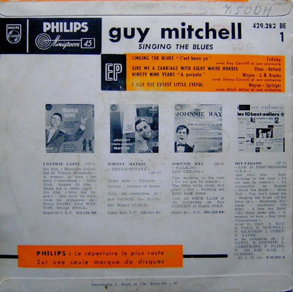 ?? 61....4-33005....GUY MITCHELL Orchestra under the direction of Joe Sherman..Heartaches By The Number (ZSP 48252)/GUY MITCHELL with RAY CONNIFF and his ORCHESTRA..Singing The Blues (ZSP 39219) (41476/40769)