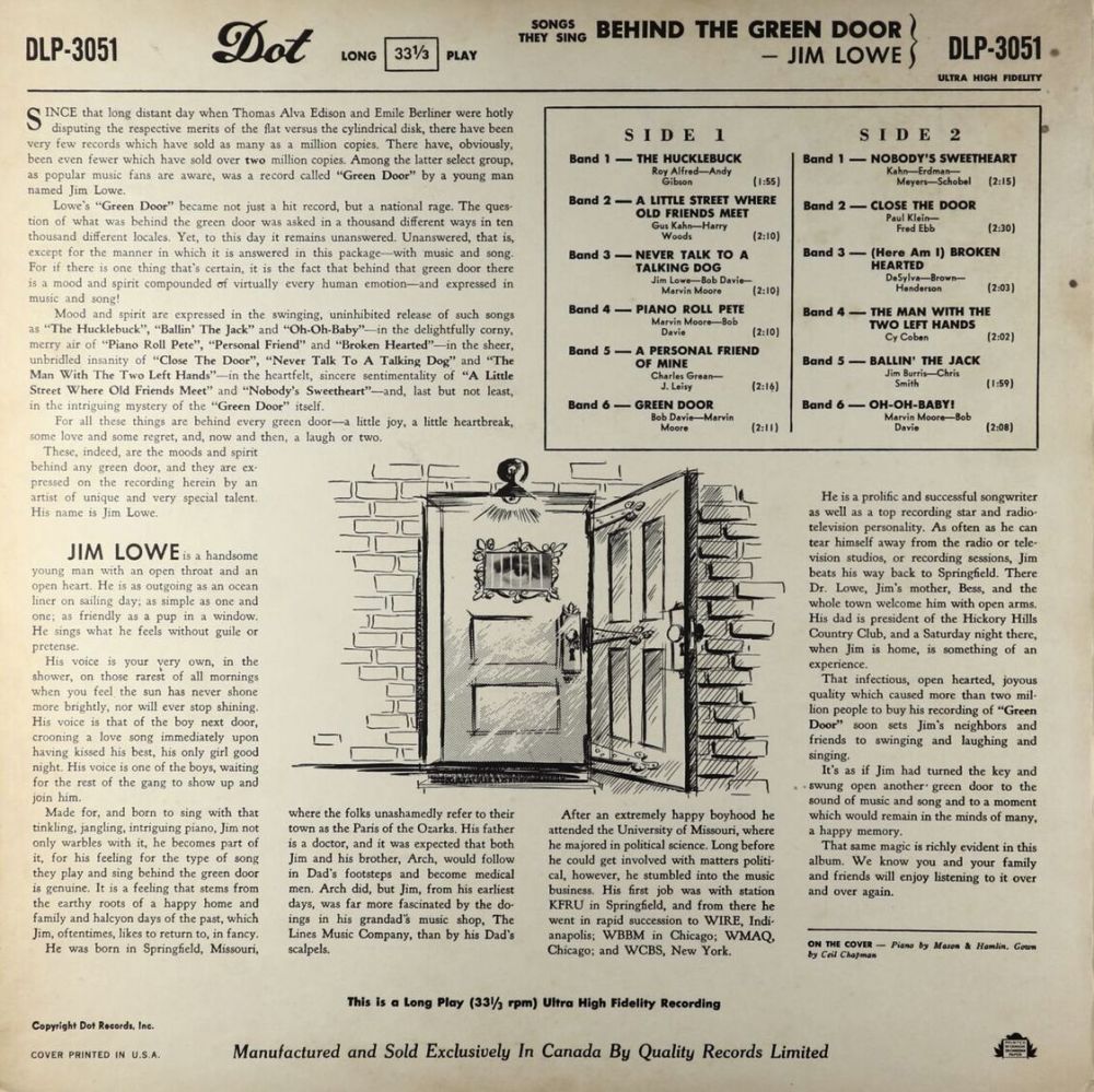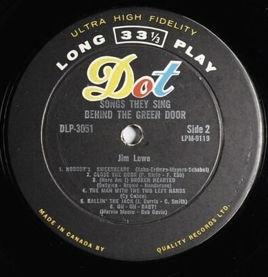 Der Sänger-Songwriter Jim Lowe wurde am 7. Mai 1923 in Springfield, Missouri, als James Ellsworth Lowe geboren und verstarb am 12. Dezember 2016 in East Hampton, New York. Bei uns wurde er am bekanntesten mit dem von ihm gesungenen Titel "The Green Door", der aber nicht aus seiner Feder stammte. Den größten Erfolg als Songwriter hatte er wohl mit "Gambler's Guitar", mit den Rusty Draper bis in die Top 10 kam.