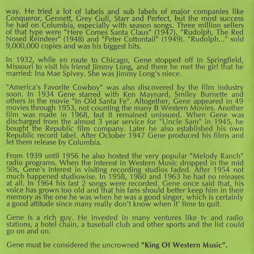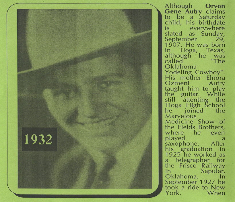 Gene Autry, der Sänger, Gitarrist, Komponist, Schauspieler, Rodeo-Darsteller, Baseball-Teambesitzer und vieles mehr, er bekam den Spitznamen ”The Singing Cowboy”, wurde am 29. September 1907 in Tioga, Texas, als Orvon Grover Autry geboren und verstarb am 2. Oktober 1998 in Studio City, Kalifornien.
