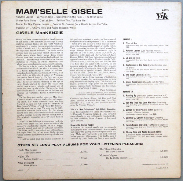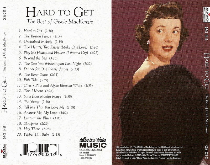 Sie nahm Alben und Singles mit 45 U / min fĂŒr verschiedene Plattenlabels auf, insbesondere fĂŒr Capitol und RCA. Ihr meistverkaufter Song war 1955 âHard To Getâ. In den frĂŒhen 60er Jahren veröffentlichte MacKenzie drei Alben â Gisele MacKenzie At the Empire Room of the Waldorf Astoria, Gisele MacKenzie Sings Lullaby and Goodnight und Losers' Lullabies. 1963 war sie wieder wöchentlich im Fernsehen zu sehen und wurde Stammgast in der âSid Caesar Showâ. âSie war eine so reizende Frauâ, sagte Caesar der L.A. Times SĂ€nger und eine groĂartige Musikerin und hatte einen groĂartigen Sinn fĂŒr Humor."