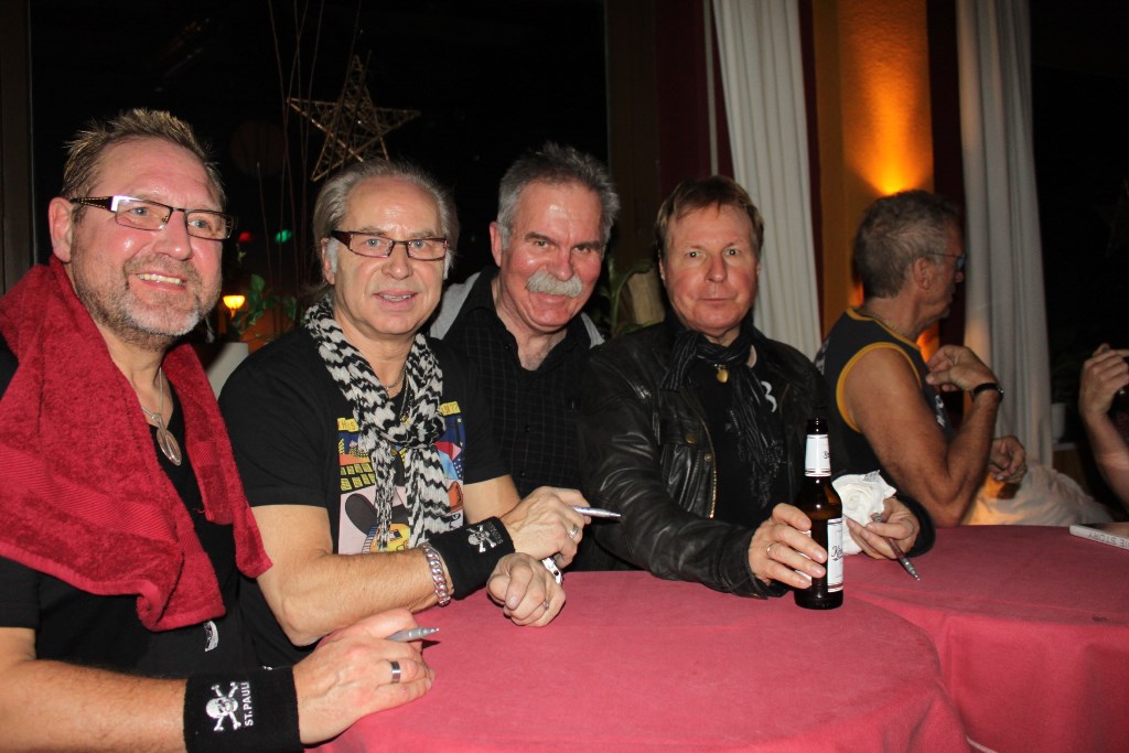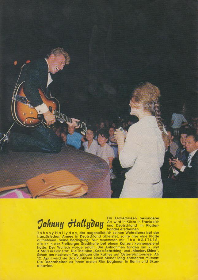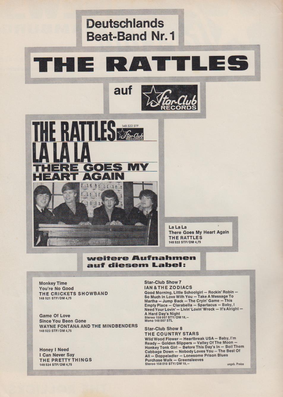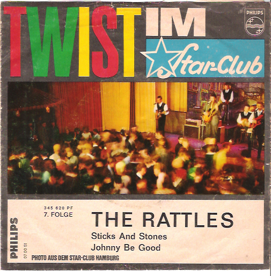 RATTLES, The (1960/61 JOACHIM REINHOLD-rg, 1961 abgelöst durch HANS JOACHIM "HAJO" KREUTZFELDT-rg (vormals Rodgers/Old Fashioned Skiffle Group, danach Solo, Mustangs), dieser Anfang 1965-Ende 1968 abgelöst durch HERMANN "RUGY" RUGENSTEIN (+)-rg, voc (vormals Four Renders), ab 1960-Mitte 1968 HERBERT HILDEBRANDT-b, voc, Herbst 1968-77 ersetzt durch KURT "ZAPPO" LÜNGEN-b (vormals Giants), 1960-66 ACHIM REICHEL-g, voc, ersetzt bis Herbst 1967 durch FRANK DOSTAL-voc (vormals Faces), September 1967-Ende 1968 ersetzt durch RAINER DEGNER (vormals German Bonds), 1969/70 ersetzt durch GEORG "GEORGE" MEIER-g, 1960-63 DIETER SADLOWSKI-d, 1963-Herbst 1967 ersetzt durch REINHARD "DICKIE" TARRACH-d (vormals Mama Betty’s Band), Herbst 1967-70 ersetzt durch PETER "PEET" BECKER-d (vormals German Bonds), zusätzlich 1966/68 BERND SCHULZ-key (vormals Faces), ab 1970 u.a. Edna Bejerano (voc-"The Witch"), Frank Mille (lg, voc, vormals Faces), Herbert Bornhold (d, vormals Tonics), Jochen 'Lude Lafayette' Peters (keyb, vormals Gash), 1974-77 Linda Fields (voc), 1974 Wolfgang 'Al' Brock (d), 1975-77 George Miller (d)), Anfänge September 1960, in 14 unterschiedlichen Besetzungen halten sie zunächst bis 1977 durch-dann ist zunächst Schluß, ACHIM spielt schon mit seinem späteren Musiker-Kollegen HERBERT HILDEBRANDT in der 2. Knaben des FC St. Pauli Fußball, bald wird für beide zum Ende der Schulzeit das Gitarrespielen wichtiger als alles andere, erste Band-Übungen in finsteren Kellern, nach ein paar Monaten Umzug in einen anderen Keller im Jugendheim HJB (Hanseatischer Jugendbund), Auftritte bei bei Clubabenden, nach ca. einem Jahr Vermittlung an einen Tanzschuppen-Auftritte übers Wochenende, Züge über die Dörfer, Januar 1963 Sieg beim 1. Star Club-Wettbewerb ("Rock- und Twistband-Wettstreit"), Management durch Manfred Weißleder ist für die Bandmitglieder der Start als Berufsmusiker, zwischen Jan. 1963 u. Aug. 1964 insgesamt 342 Auftritts-Nächte im Star Club, nach ersten Mitschnitten eines Live-Konzertes folgt der Schallplattenvertrag, Frühjahr 1963 erste Single auf Philips 345593 ("Mashed Potatoe"/"Hello"-Mitschnitt aus dem Star-Club), weitere Schallplatten auf Philips-Produktion SIGI LOCH (345617 "The Stomp"/"Zip A Die Doo Dah"-1963, "Sticks And Stones"/"Bye, Bye Johnny (Johnny Be Good)"-1963 Mitschnitt aus dem Star-Club, 345623 "Cryin’, Waitin’, Hopin’"-Mitschnitt aus dem Star-Club/"Go To Him"-1963), kurz vor Beginn der England-Tournee kommt mit REINHARD TARRACH (vormals Mama Betty’s Band) ein neuer Schlagzeuger, 05.12.1963 erster Auftritt im Liverpooler Cavern Club, Herbst 1963 England-Tour mit den Everly Brothers, Little Richard, Bo Diddley u. den Rolling Stones, 1964 wird die Wiener Stadthalle im wahrsten Sinne des Wortes zur Skandalhalle: "die Beatwelle hat in Österreich wider Erwarten eingeschlagen-die Musikgruppen RATTLES, The Liverbirds u. die TIELMAN-BROTHERS ziehen in Wien eine Show auf, die selbst die Beatles blass werden läßt-die Wiener Jungend tobt, die Show rollt vor etwa 8000 Jugendlichen ab", November 1964 Tournee ("Hit-Parade") durch deutsche Hallen, Philips (LPs "Live Im Star-Club Hamburg"-1964, "The Searchers Meet The Rattles"-1964, "Twist im Star-Club Hamburg"-1964, "Liverpool Beat"-1965, "Star Club Show 1"-1965, "Hurra, Die Rattles Kommen"-1966, 345826 "JOHNNY HALLYDAY Meets The RATTLES"-1965, 345826 "Laß Die Leute Doch Reden"/"It’s Monkeytime"-1965 & JOHNNY HALLYDAY), 1964/65 Ariola (10586 "Baby That Is Rock’n’Roll"/"Everybody Loves A Lover"-1964 Mitschnitt aus dem Star-Club, 10638 "Tell Me What Can I Do"/"Sunbeam At The Sky"-1964 Mitschnitt aus dem Star-Club, 10640 "What Do You Want With My Baby"/"My Gal Is Red Hot"-1964 Mitschnitt aus dem Star-Club, 10698 "Bye Bye Johnny"/"Sweet Little Sixteen"-1964 Mitschnitt aus dem Star-Club, 10934 "Memphis Tennessee"/"Twist And Shout"-1964 Mitschnitt aus dem Star-Club, 18010 "Spanish Harlem"/"Bo Diddley"-1964 Mitschnitt aus dem Star-Club, LPs), Opera, ab 1964 Star-Club Records/Philips (148502 "Geh’ Zu Ihm"/"Bye, Bye, Baby"-1964, 148503 "Do Wah Diddy Diddy"/"Betty Jean"-1964, 148512 "Shame, Shame, Shame"/"Someone Who Is Just Like You"-1964, 148522 "La La La"/"There Goes My Heart Again"-1965, 148536 "Come On And Sing"/"Candy To Me"-1965, 148541 "(Stopping In) Las Vegas"/"Lean Jean 17"-1965, 148555 "Love Of My Life"/"Say Alright"-1966, 148571 "It Is Love"/"Hey Sally"-1966, 148583 "Cauliflower"/"I Will Always Stay Your Friend"-1966/67), Pseudonym The "IN" CROWD 148547 ("Sha-La-La-La-Lee"/"Old McDonald"-1966), Fontana-Produzent: HERBERT HILDEBRANDT (269364 "Raindrop"/"I’ll Catch Her"-1967, 269379 "After Tea"/"Thank You"-1968, 269384 "Fought The Lord"/"Lady Angeline"-1968, "Mr. …"/"… Keep Your Hands Off My Sister"-1968, 269398 "Geraldine"/"The Witch"-1969, 269407 "Lady Love"/"Ice On Fire"-1969), 1965 Film "Hurra! Die Rattles Kommen!"-ihre Stimmen wurden synchronisiert, 1966 Teilnahme an der Bravo-Beatles-Blitztournee, 1966 Einberufung ACHIM REICHEL zum Militär, Herbst 1966 Versuchs-Singles unter den Namen The Fixx u. Our Gang, spätere Umbesetzungen, 1967 Bravo-Trip nach Finale Ligure, 1969 Hit mit "The Witch"-Gesang u. key HENNER HOIER (Mitglied 1969/70 mit anschließender Solo-Karriere), 1977 Auflösung der Band, 1988 Reunion-Konzerte, 1990 schicken ACHIM (bis 1991) u. HERBERT (bis 1996 u. später) ihre alte Band mit zwei weiteren Rattles-Veteranen der frühen Jahre DICKY TARRACH (bis 1996 u. später) u. HENNER HOIER (bis 1993) mit der neuen LP "Hot Wheels"-1989 noch einmal ins Rennen, LPs "Was Echtes"-1989, "Painted Warriors"-1990, 20 TV-Shows u.a. "Musik Liegt In Der Luft", "ZDF Hitparaden Special", "Tommi’s Oldie Night", CDs auf Bear Family Records