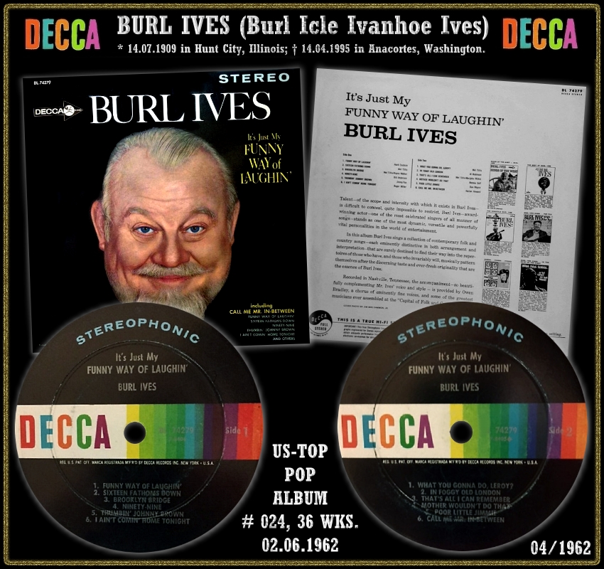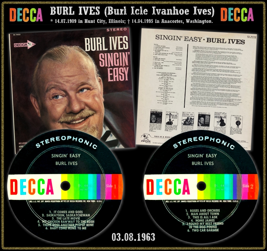 Der Folk-Sänger, Autor und Schauspieler Burl Ives wurde am 14. Juni 1909 in Hunt City, Illinois, als Burl Icle Ivanhoe Ives geboren und verstarb am 14. April 1995 auf seinem Wohnsitz in Anacortes, Washington.