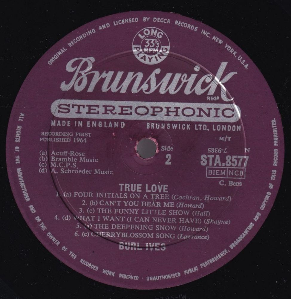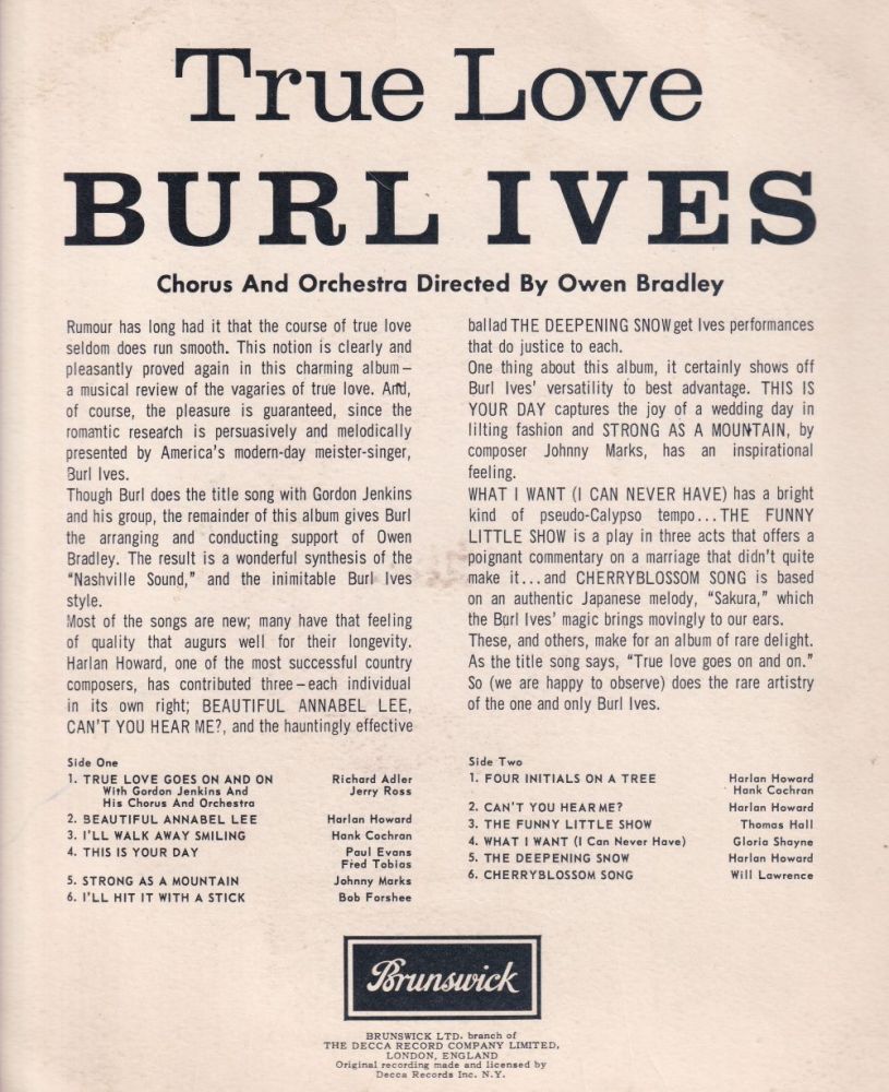 12 63….31571….BURL IVES Vocal With Chorus And Orchestra Directed By GORDON JENKINS..True Love Goes On And On (85989)/I Wonder What’s Become Of Sally (L 7788)
