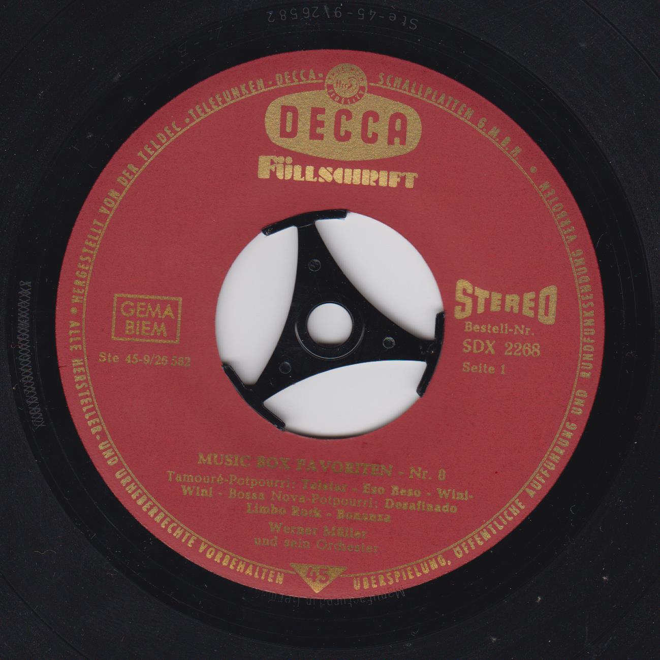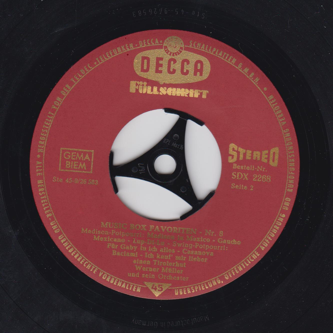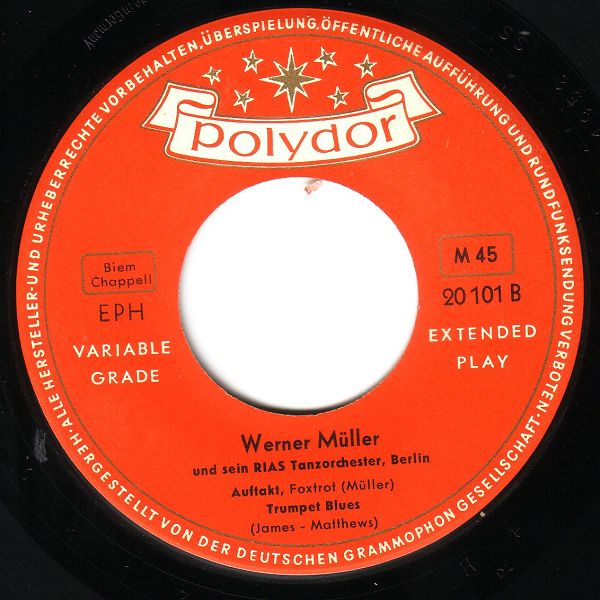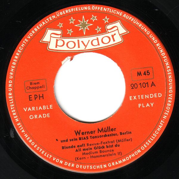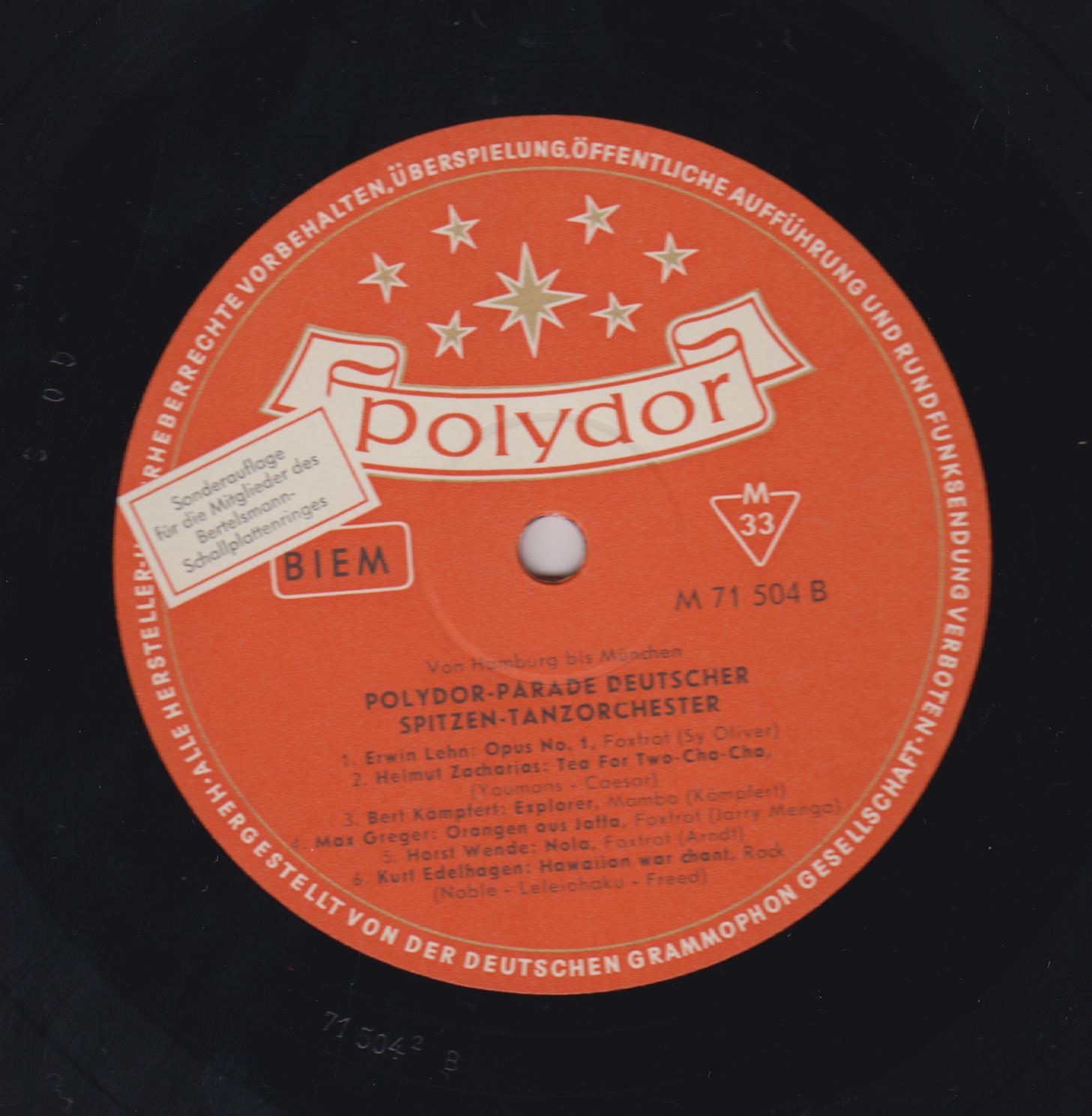 Der eingeprägte Polydor-Code gibt meiner Ansicht nach das Herstellungsdatum der Matrize an und nicht das Preßdatum der Platte. Gerade vor ein paar Tagen habe ich in einem "Ramsch-Konvolut" nicht weniger als 10 Exemplare von Nr. 23453 (Caterina Valente) auf einen Schlag ins Haus bekommen, und alle haben durch die Bank "E 7" für Mai 1957 im Wachs, obwohl die Labels zwei deutlich verschiedene Varianten zeigen (einmal mit Erwähnung des Films "Das einfache Mädchen", einmal ohne), auch die Preßqualität der Platten selbst ist unterschiedlich - manche mit glatter Kante aus pechschwarzem Vinyl, andere mit scharfer Kante aus dunkelrot durchscheinendem Polystyrol - d.h. sie stammen unmöglich alle aus ein und derselben Auflage der Platte. Dennoch ist der Code immer gleich, es sind auch immer dieselben Matrizen mit exakt gleicher Positionierung der Prägeziffern und -buchstaben in der Auslaufrille.