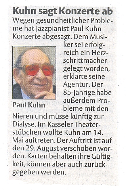 ... das Konzert mit Paul Kuhn am 14. Mai in Kassel wurde abgesagt, bzw. auf einen späteren Zeitpunkt verlegt. Details stehen im folgenden Zeitungsausschnitt (HNA vom 20.4.2013). Für Paul Kuhn die besten Genesungswünsche.