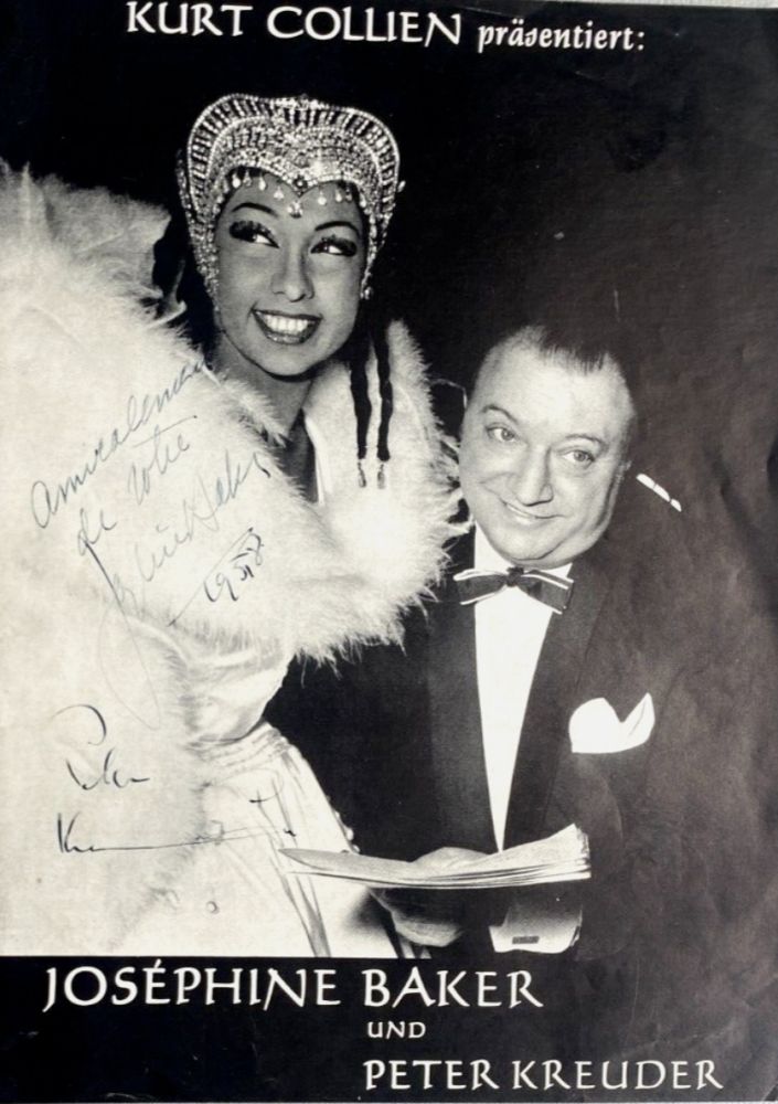 Sie ist eine der ganz Großen des Kabaretts. Ihr Ruhm überstrahlte schon in jugen Jahren selbst den einer Duncan und Mistinguette. Ohne zu übertreiben, darf man sie als erfolgreichste Chansonette der letzten Jahrzehnte bezeichnen. Es lohnt sich deshalb, einiges aus ihrem ereignisreichen Leben zu berichten: Ihr Geburtsort ist St. Louis (USA), wo sie als Tochter eines Spaniers und einer Negerin (*) das Licht der Neuen Welt erblickte. Das war 1906. Als Achtjährige stand Josephine bereits im Scheinwerferlicht eines Kabaretts des New Yorker Negerviertels Harlem. Dann trat sie in Operetten und Revuen auf. Nach dem ersten Weltkrieg war as Paris, wo sie in kürzester Zeit zum Weltstar avancierte durch die Erfindung des Charleston, der damals als Modetanz die ganze Welt im Sturm eroberte. Ihre knabenhafte Erscheinung und ihre Kleidung - ein Bananengürtel mit Federbehang — wurden einer Generation zum Inbegriff der Lebensfreude in einer hektischen Zeit, gleichzeilig ober auch für viele zum Ärgernis. Das puritanische England lehnte sie ab. In Belgrad empfingen sie eifersüchtige Ehefrauen mit Stinkbomben, in Warschau verbot ihr die Polizei die Einreise und 1929 schlugen in München national-soziatistische Elemente und konfessionelle Gruppen Radau. Josephine ging schließlich nach Amerika zurück, und es dauerte Jahre, bis Europa sie wiedersah.