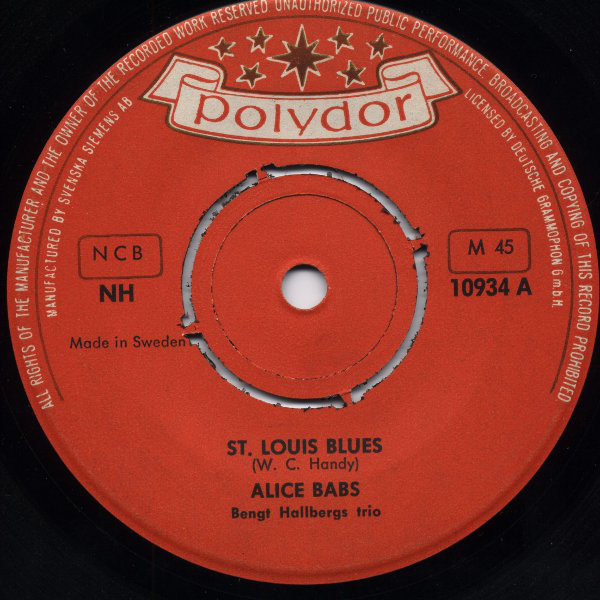 04 63....12 987 A....ALICE BABS Bengt Hallberg Trio..St. Louis Blues Twist/ B….ALICE BABS Bengt Hallberg Orchestra..Jazz Fuga (S: POLYDOR 10934/10935)