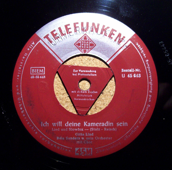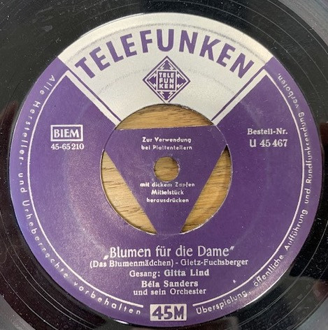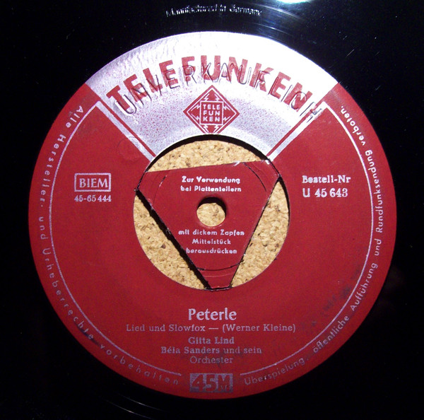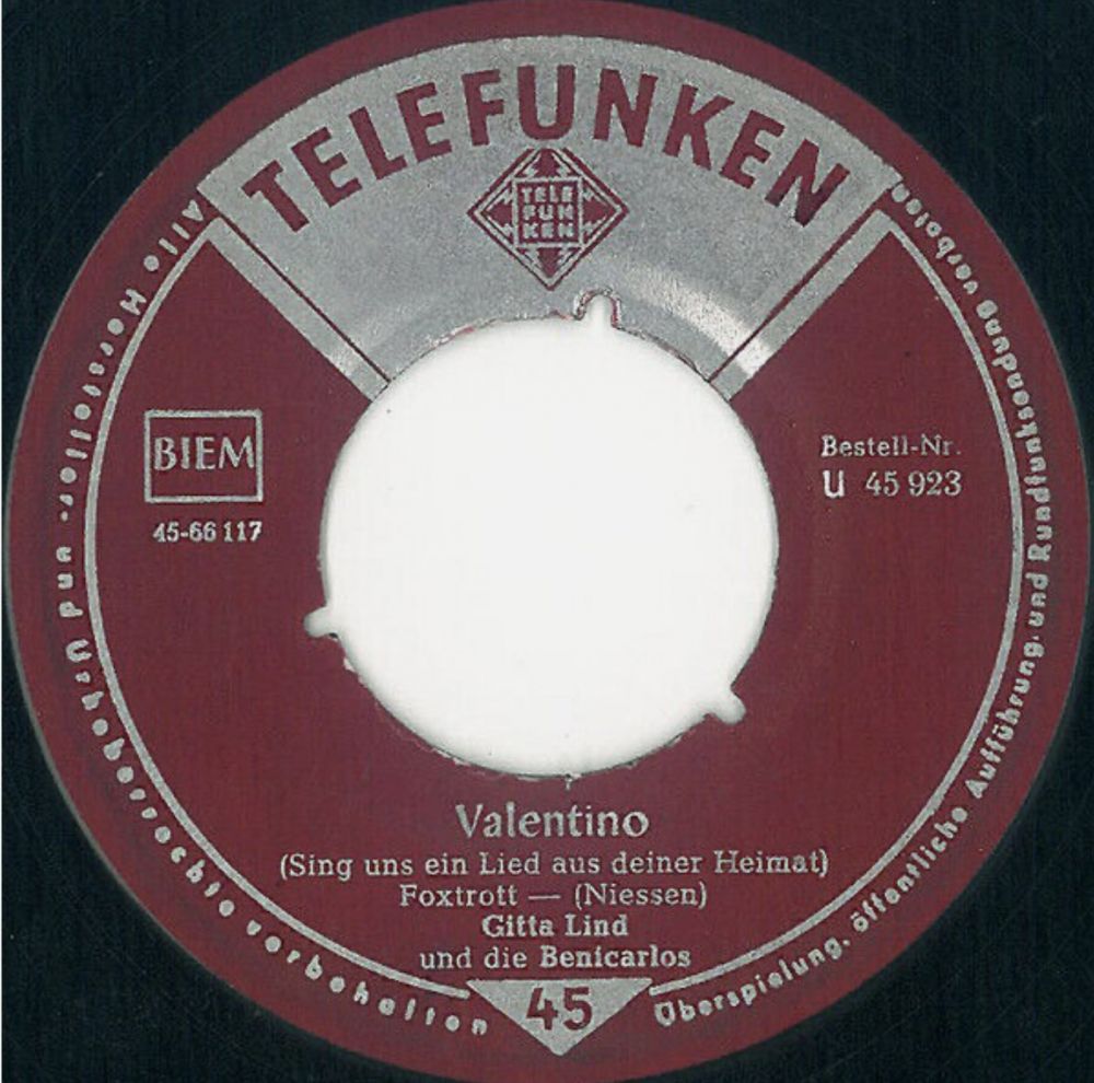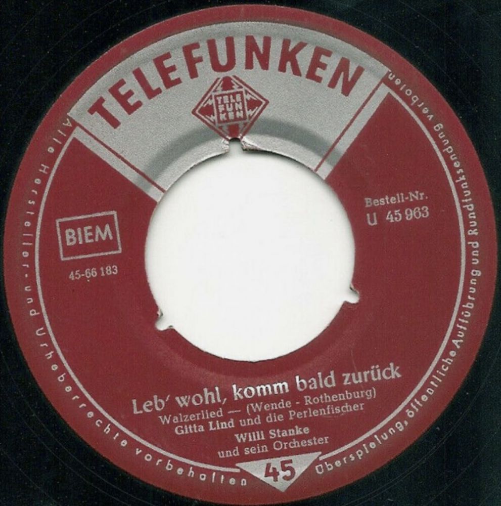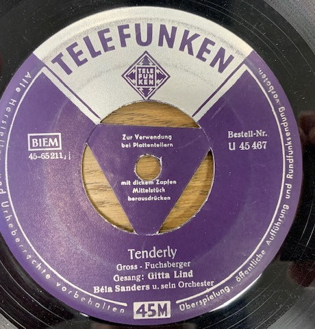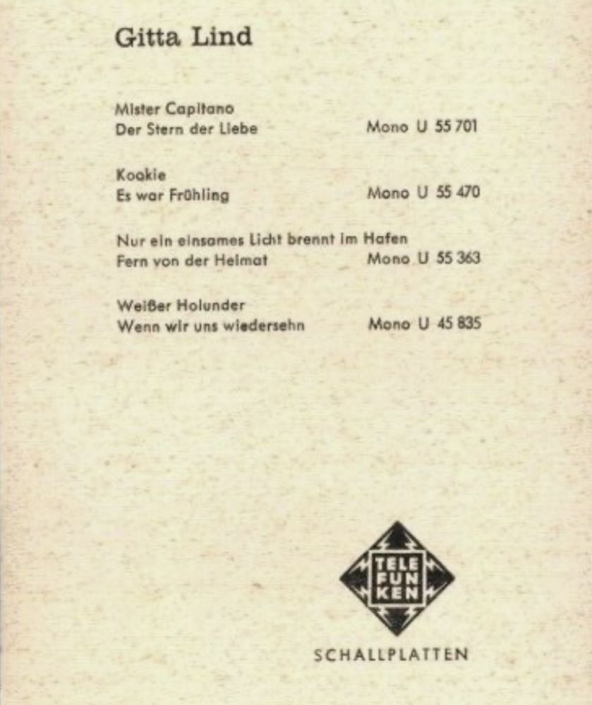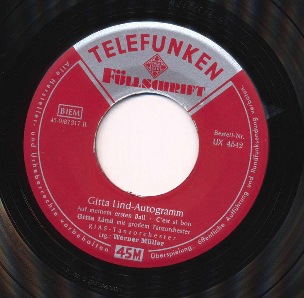 Da Gitta Lind bereits bei der Umstellung auf den neuen Tonträger (Vinyl und 45 RPM) aktiv war nutze ich die Gelegenheit und zeige, wie die ersten 45er Singles bei TELEFUNKEN bis etwa 1955 vor der Verwendung des TELDEC-Triangels ausgesehen haben.