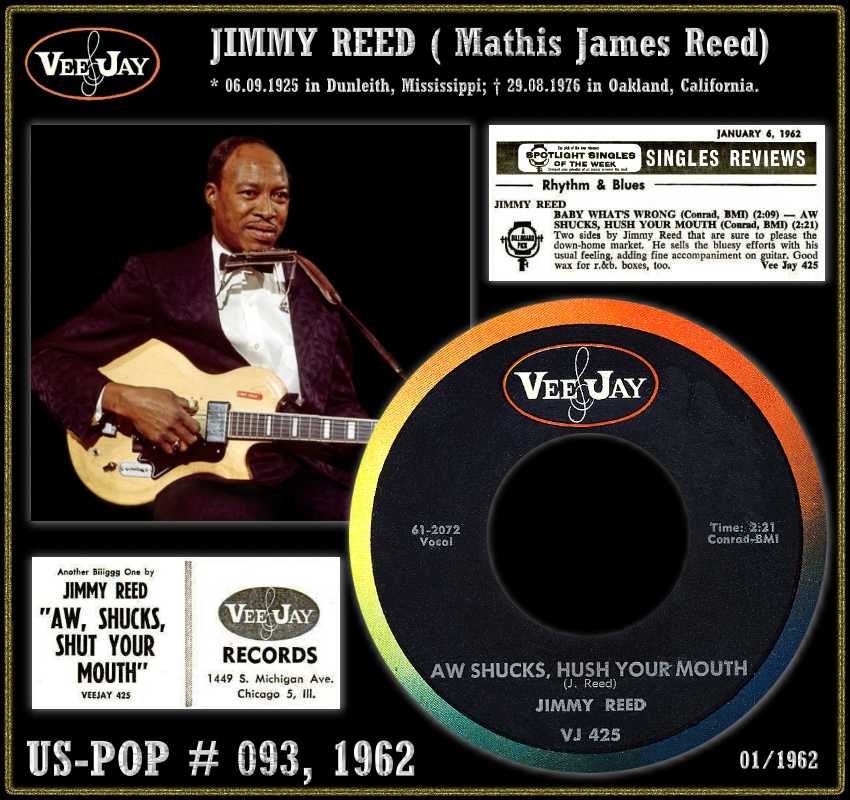 Der Blues-Musiker (Gitarre, Harmonika und Gesang) Jimmy Reed wurde am 6. September 1925 in Dunleith, Mississippi, als Mathis James Reed geboren und verstarb am 29. August 1976, erst 50-jährig, in Oakland, Kalifornien, an Atemstillstand nach einem epileptischen Anfall.
