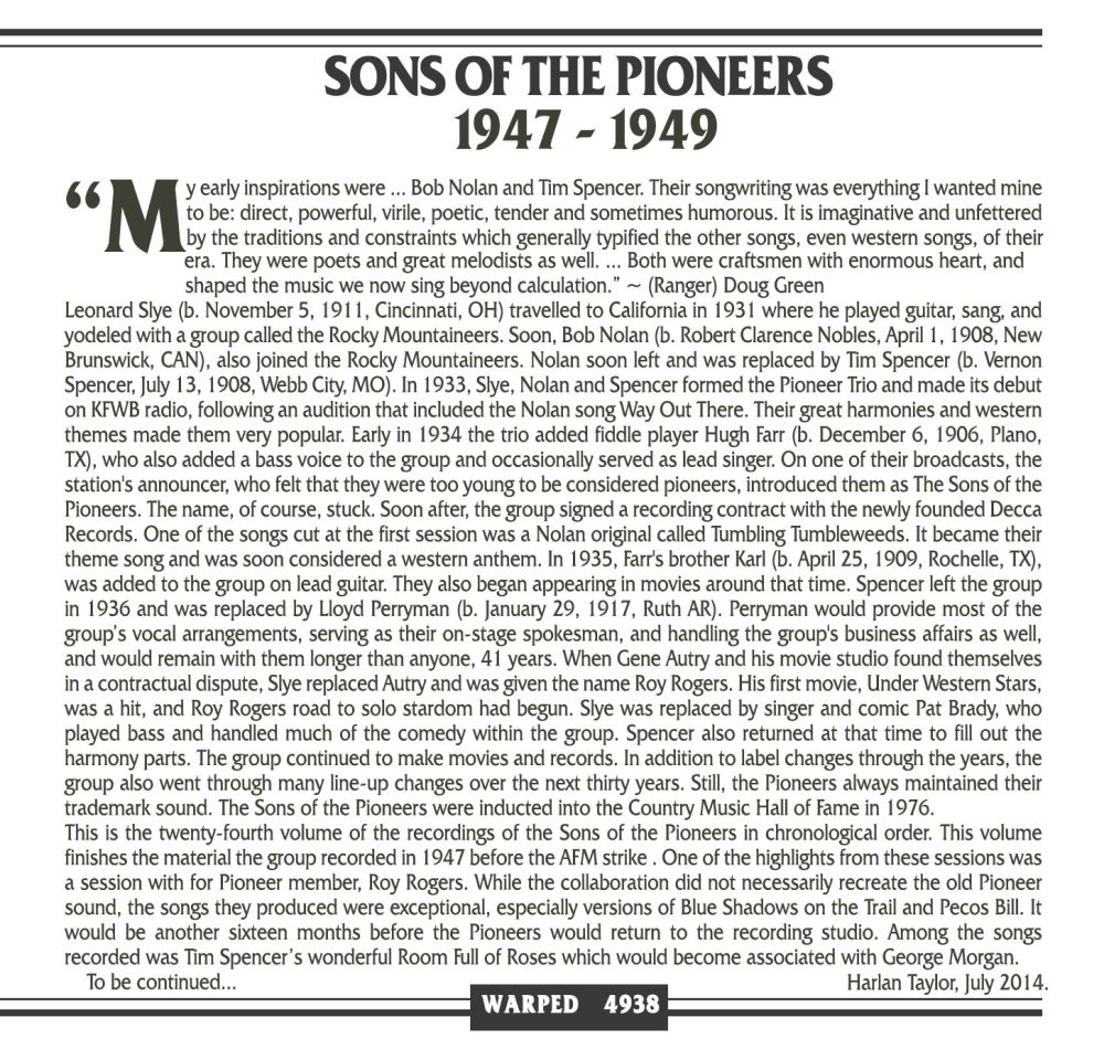 Es sollten weitere sechzehn Monate vergehen, bis die Pioneers ins Aufnahmestudio zurückkehrten. Unter den aufgenommenen Songs befand sich Tim Spencers wunderbares “Room Full of Roses“, das später mit George Morgan in Verbindung gebracht werden sollte.