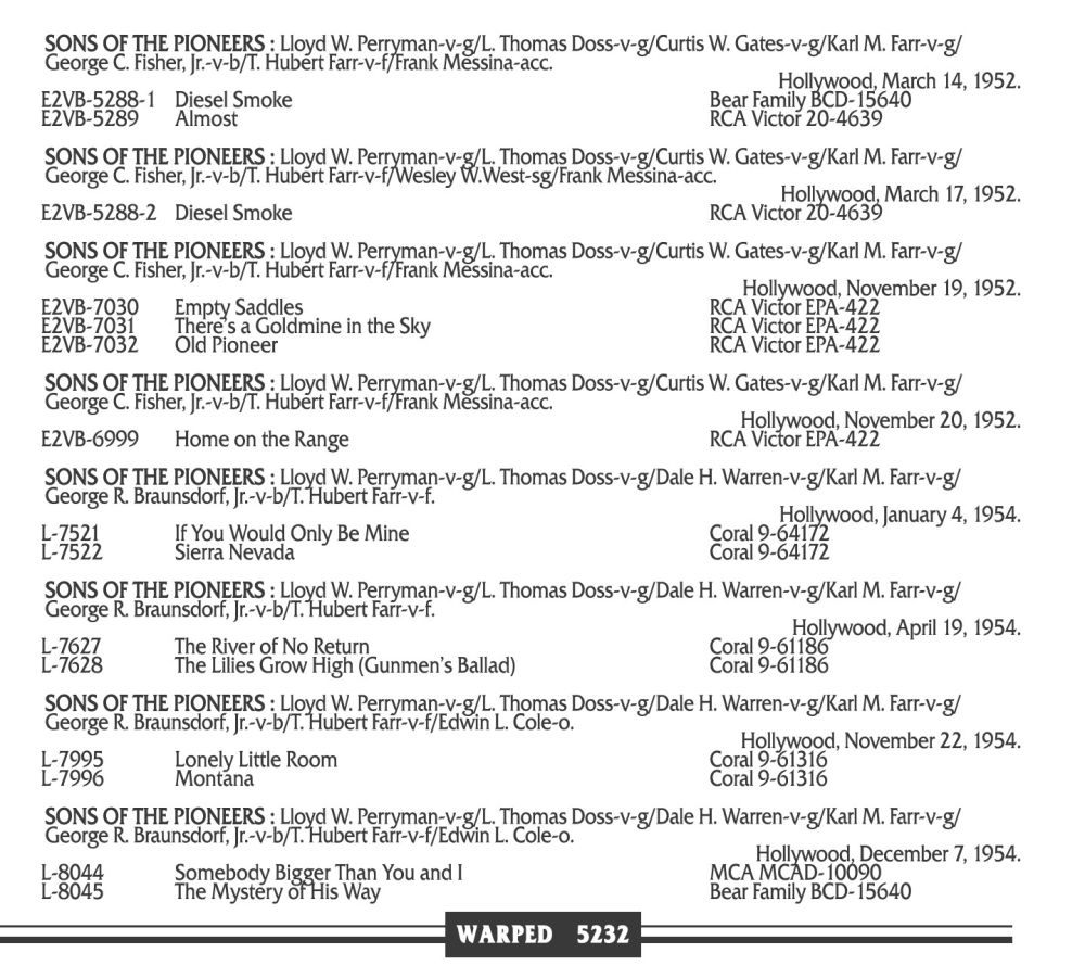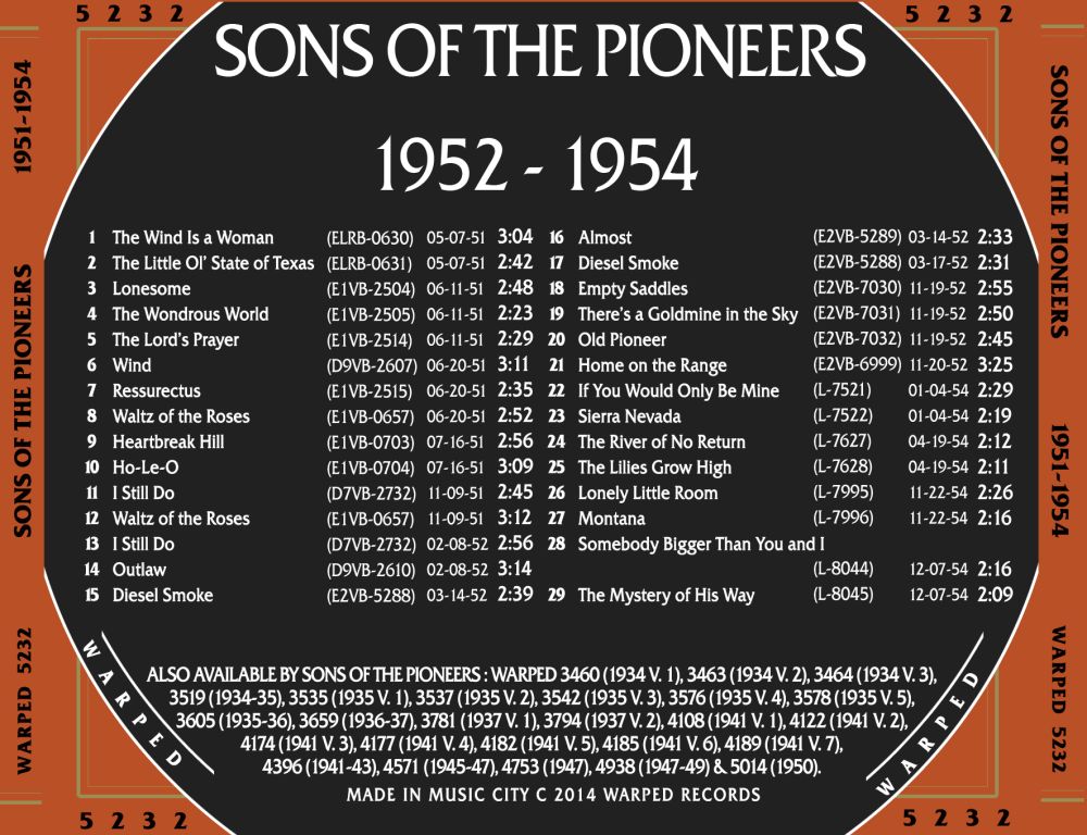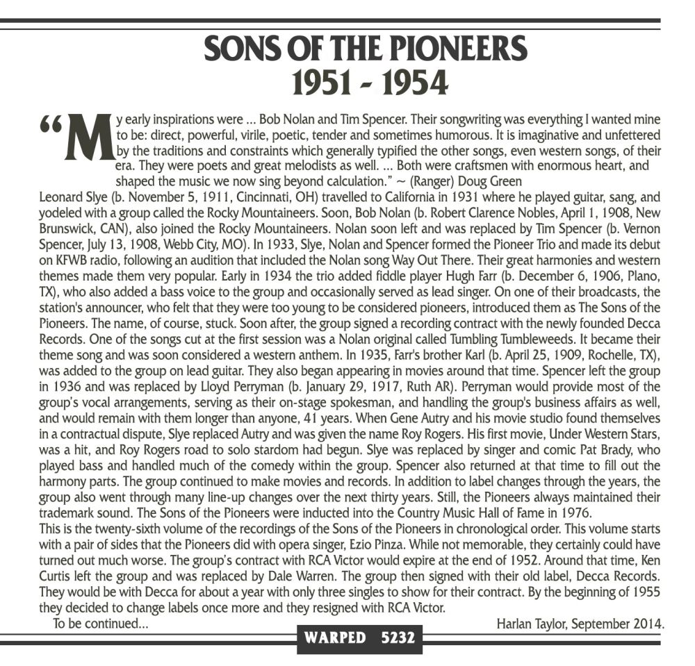 Dies ist der 26. Band der Aufnahmen der Sons of the Pioneers in chronologischer Reihenfolge. Dieser Band beginnt mit zwei Stücken, die die Pioneers mit dem Opernsänger Ezio Pinza aufnahmen. Obwohl sie nicht besonders einprägsam sind, hätten sie durchaus erfolgreicher werden können. Schlimmer noch. Der Vertrag der Gruppe mit RCA Victor lief Ende 1952 aus. Um diese Zeit verließ Ken Curtis die Gruppe und wurde durch Dale Warren ersetzt. Die Gruppe unterschrieb daraufhin bei ihrem alten Label Decca Records. Sie blieben etwa ein Jahr bei Decca und veröffentlichten in dieser Zeit lediglich drei Singles.