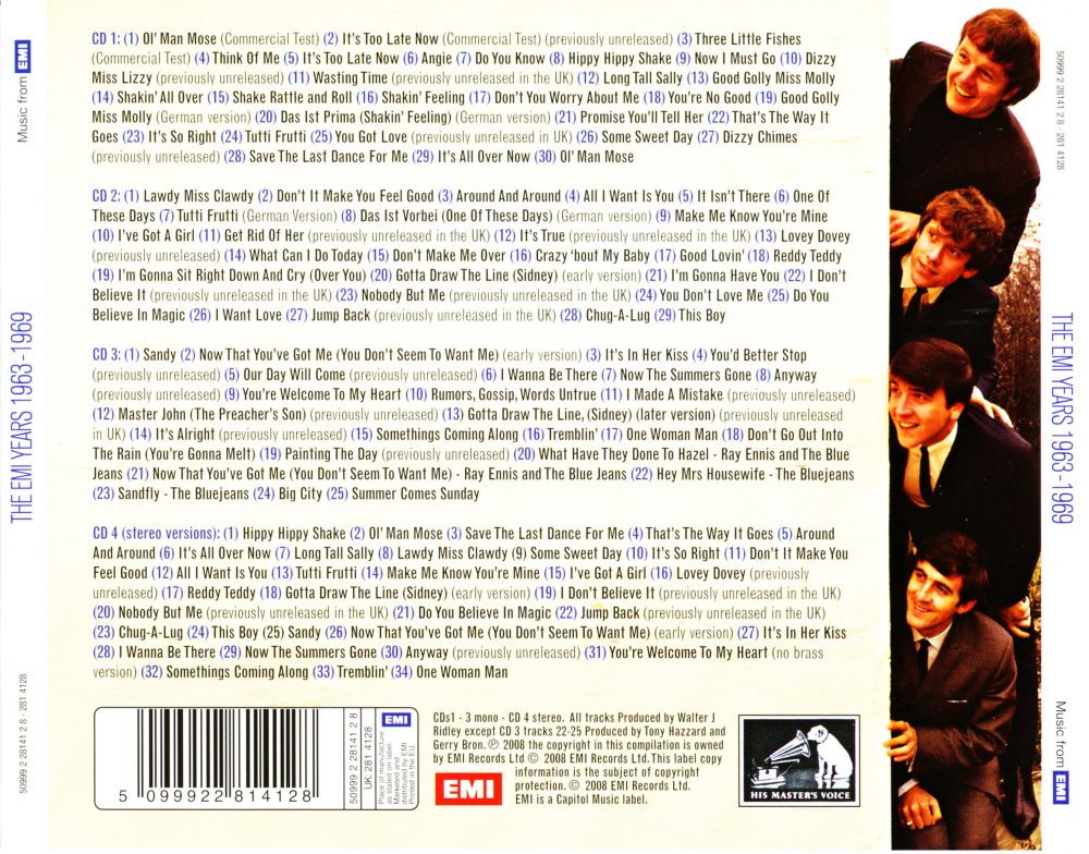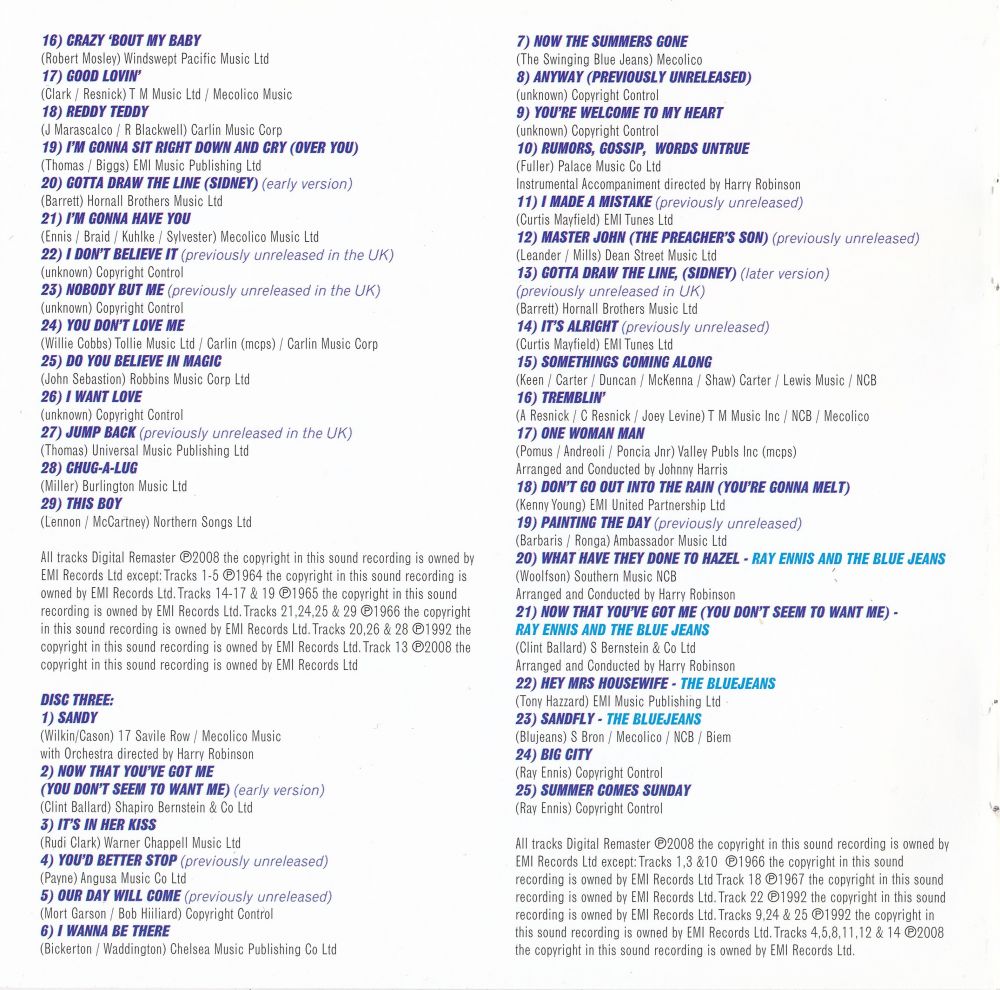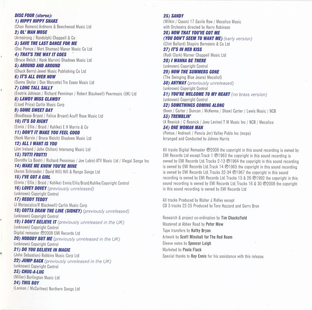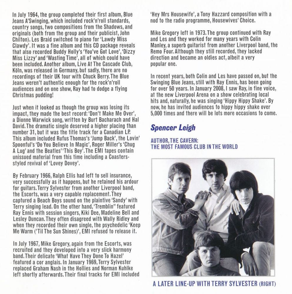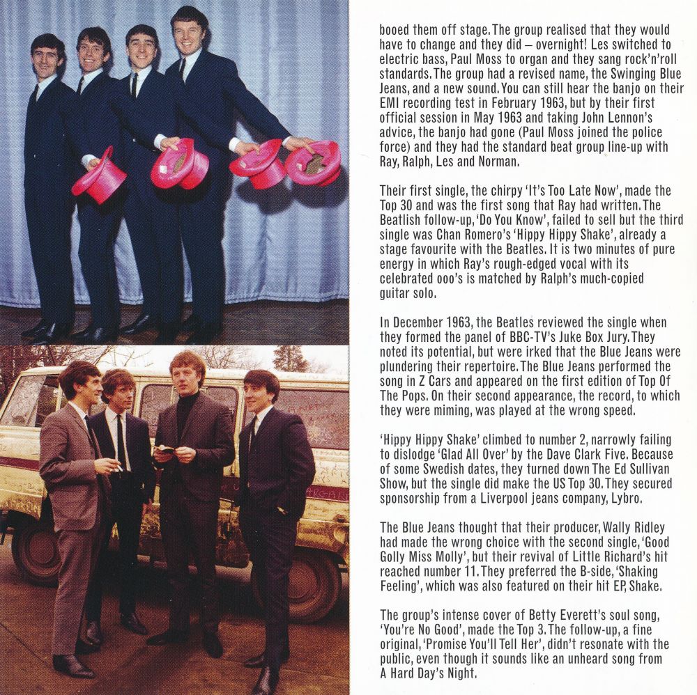 Zwischen 1963 und 1966 landeten The Swinging Blue Jeans fünf Top 40-Singles, ihr größter Hit “Hippy Hippy Shake“ landete 1963 sogar auf # 2. Wenn man jedoch ein wenig an der Oberfläche kratzt, findet man eine Band, die so viel mehr verdient hätte. Ihr Katalog ist reich und randvoll mit Merseybeat-Perlen und gefühlvollen Juwelen, alle ihre Single-A- und B-Seiten aus den 60 er Jahren, ihr einziges britisches Album “Blue Jeans A' Swinging“ von 1964, “Don't Make Me Over“, ihre 1966 nur in Kanada erschienene LP und eine Auswahl schwer erhältlicher Titel, von denen viele zum Zeitpunkt der Aufnahme noch nie veröffentlicht wurden.