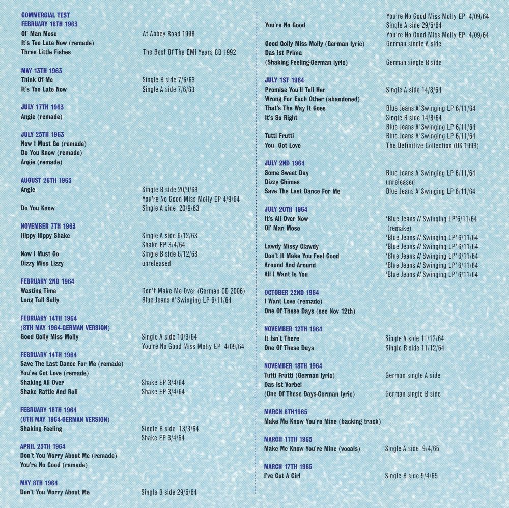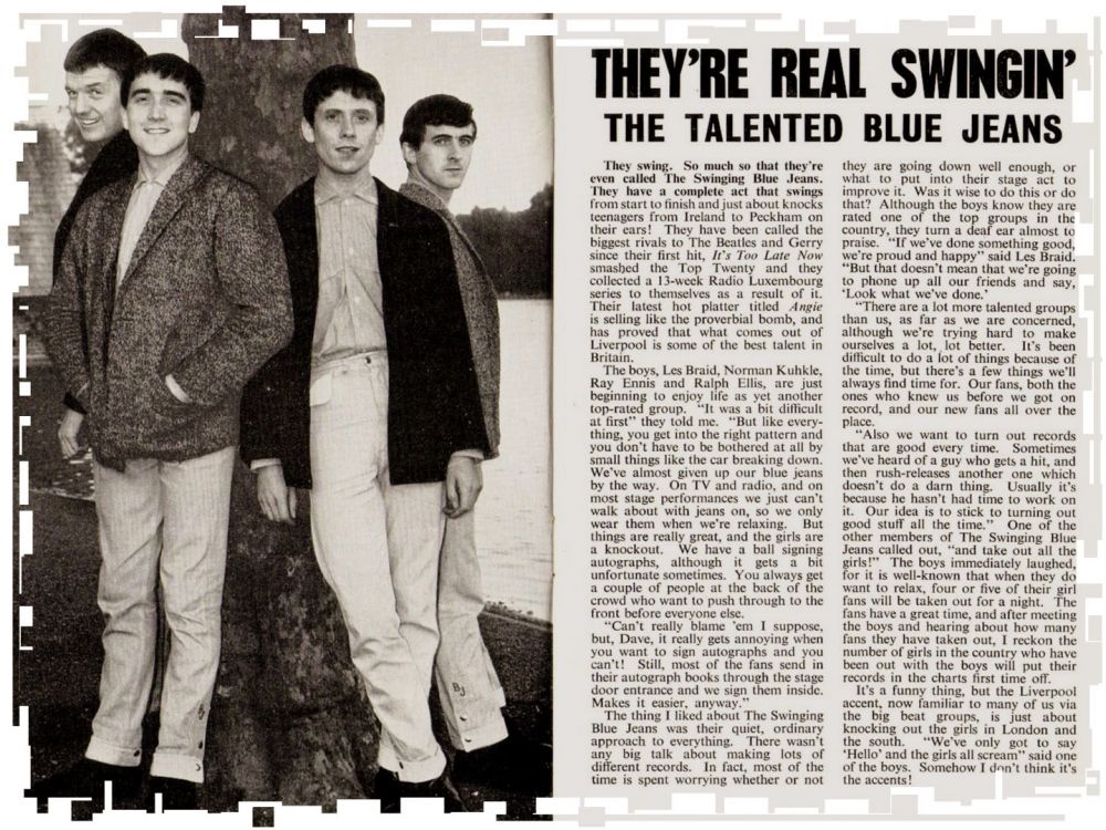 Die im August erschienene Single “Promise You'll Tell Her“, eine Gruppenkomposition, konnte nicht überzeugen, ebenso wenig wie ihr einziges UK-Album “The Blue Jeans A' Swinging“, das im November erschien. Die Aufnahme erfolgte in zwei Sessions an einem Tag. Die Aufgabe bestand darin, ihr Live-Set und ihren Sound auf 12 Tracks festzuhalten, die meisten davon Rock'n'Roll-Cover, darunter Little Richards “Tutti Frutti“, Chuck Berrys “Around And Around“ und Lloyd Price‘ “Lawdy Miss Clawdy“. Das Spiel war straff, die Gesangsdarbietungen durchweg engagiert.