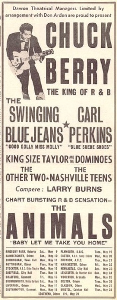 Im Mai begleiteten sie Chuck Berry und Carl Perkins in ganz Großbritannien. „Der Kartenverkauf lief nicht sehr gut, also baten sie uns, es zu tun. Carl Perkins war brillant, aber Chuck sprach nie mit irgendjemandem. Die Show begann um 19:30 Uhr, er kam kurz vorher rein, ging direkt in seine Garderobe und kam erst wieder raus, wenn er auf die Bühne musste. The Animals und King Size Taylor waren auch auf dem Programm. Es war ein tolles Preis-Leistungs-Verhältnis.“