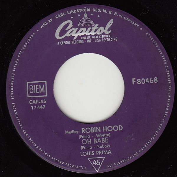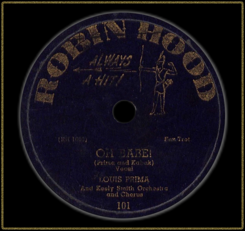 09 50….45-100….Vocal LOUIS PRIMA Orchestra and Chorus..Angelina (45 RH 1001)/Robin Hood (45 RH 1002)