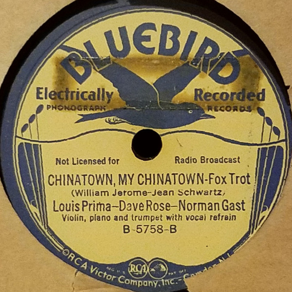 12 34….B-5758-A….Louis Prima-David Rose-Norman Gast Violin, piano and trumpet with vocal refrain..Dinah/-B….Chinatown, My Chinatown (5296)