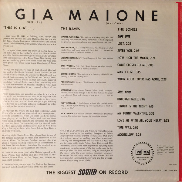 ?? 63….PR-1005….GIA MAIONE Music by Louis Prima - Sam Butera and The Witnesses ..On The Other Side Of Tears/Please Don't Knock On My Heart