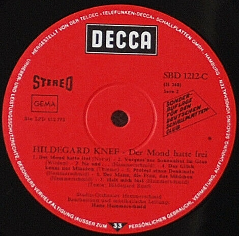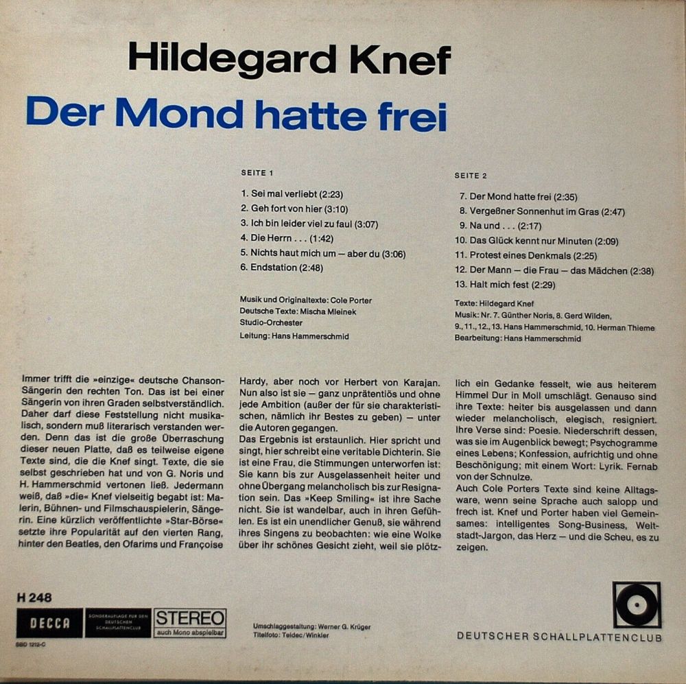 Nanunanu! #77 und #83 haben dieselbe Fontana-Nummer (460.591), aber #77 hat einen Titel mehr, wenn man der Hülle glauben darf (fünf Titel auf einer EP sind sogar in Frankreich ungewöhnlich....). Ist der seit der Erstauflage dazugekommen, oder weggefallen, oder schlicht ein Druckfehler auf der einen Hülle? Außerdem heißt sie einmal Hildegarde Neff und einmal Hildegard Knef - ja was denn nun?!