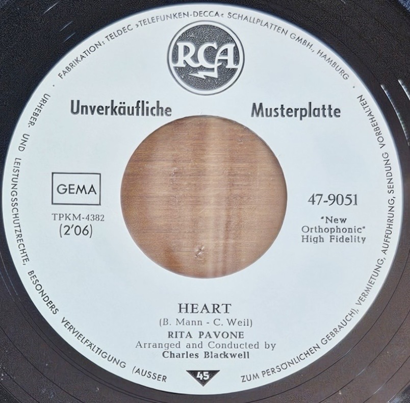 03 67….47-9051….RITA PAVONE Arranged and Conducted by Charles Blackwell..Heart/RITA PAVONE Arranged by Geoff Love and His Orchestra..The Man Who Made Music (GB: RCA Victor 1553)