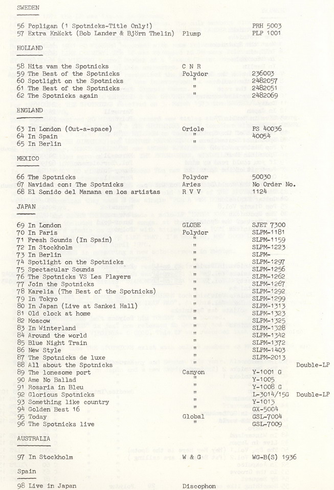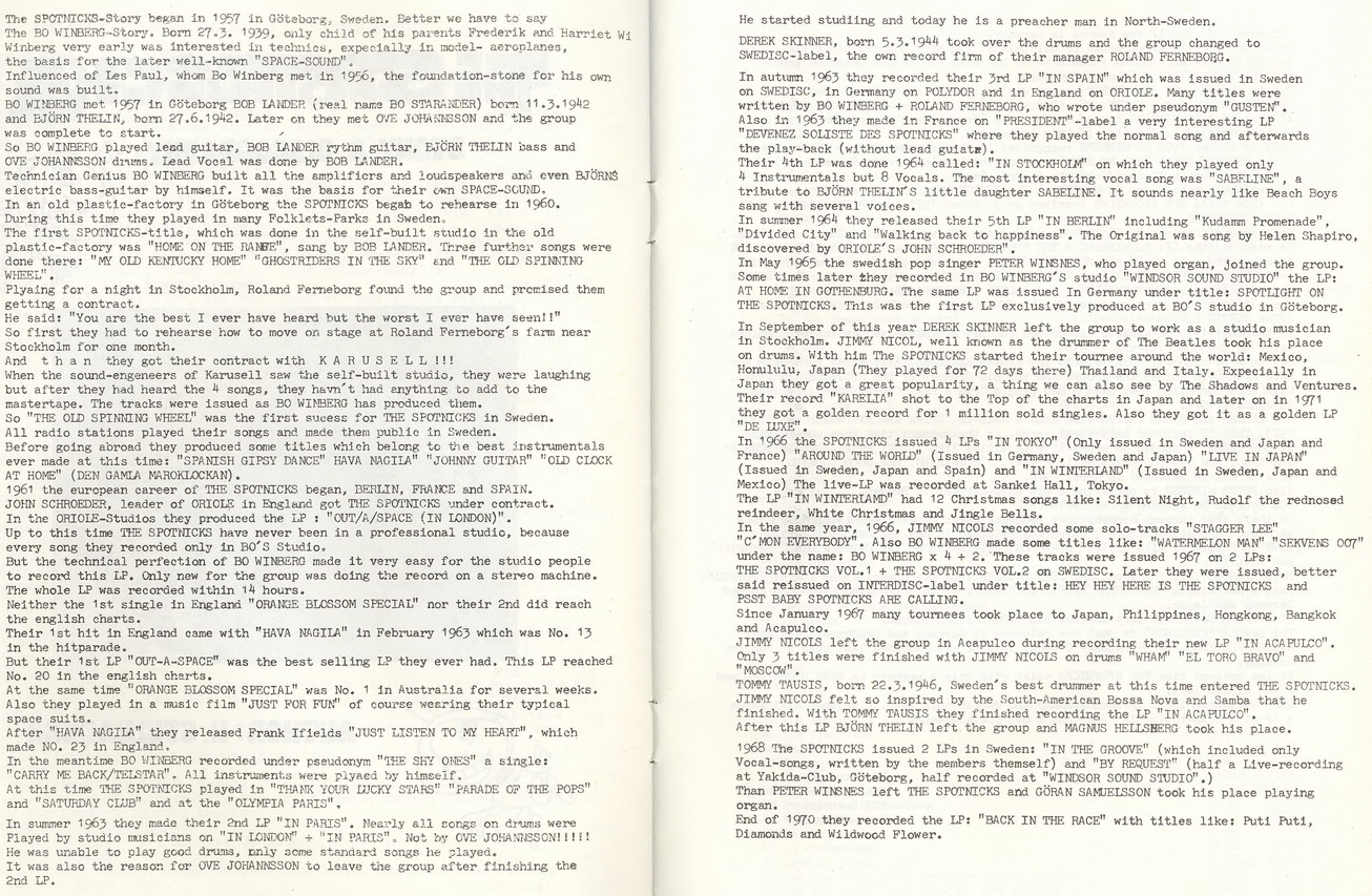 Eigentlich sind skandinavische Popgruppen in der internationalen Musikszene nie mit durchschlagendem Erfolg in Erscheinung getreten, sieht man einmal von der ABBA-Hysterie ab. Dennoch gab es einige gute Formationen wie die früheren Hep-Stars, die Hootenanny Singers oder Savage Rose, aber sie waren mehr Insidern als der breiten Konsumentenschicht geläufig. Um so erstaunlicher ist es gewesen, daß es gerade einer Intrumentalband gelang, sich in Europa neben den Shadows und in Japan neben den Ventures zu behaupten - die Spotnicks aus Göteborg.