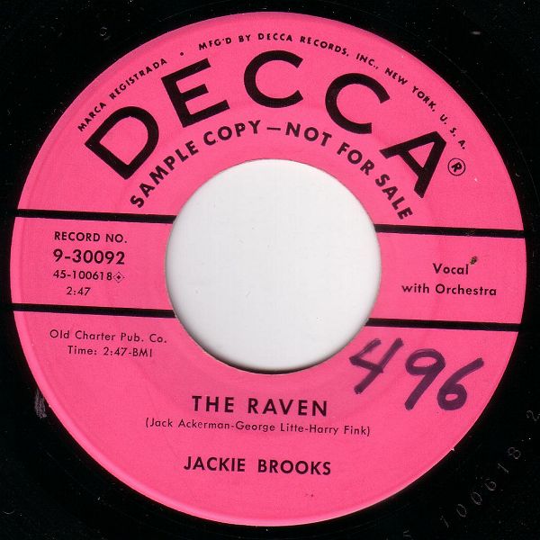 10 56....9-30092....JACKIE BROOKS..My Blues Are Out Walkin' (45-100617)/The Raven (45-100618)