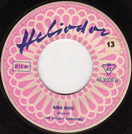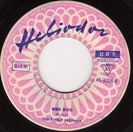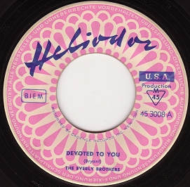 Original-Label: Cadence 1350, deutsche Matritzenherstellung H 8 ( August/1958), Composer von A : “Boudleaux Bryant” und B : “Boudleaux Bryant ”, deutsche Platte auf rosa Label, Bildcover, Placierung Hitparade in den USA: “Devoted To You” 8/58, # 10 pop, # 7 country, # 2 r&b und “Bird Dog” 8/58, # 1 pop, # 1 country, # 2 r&b