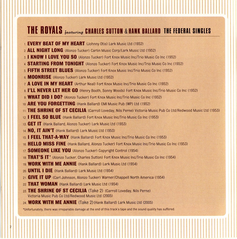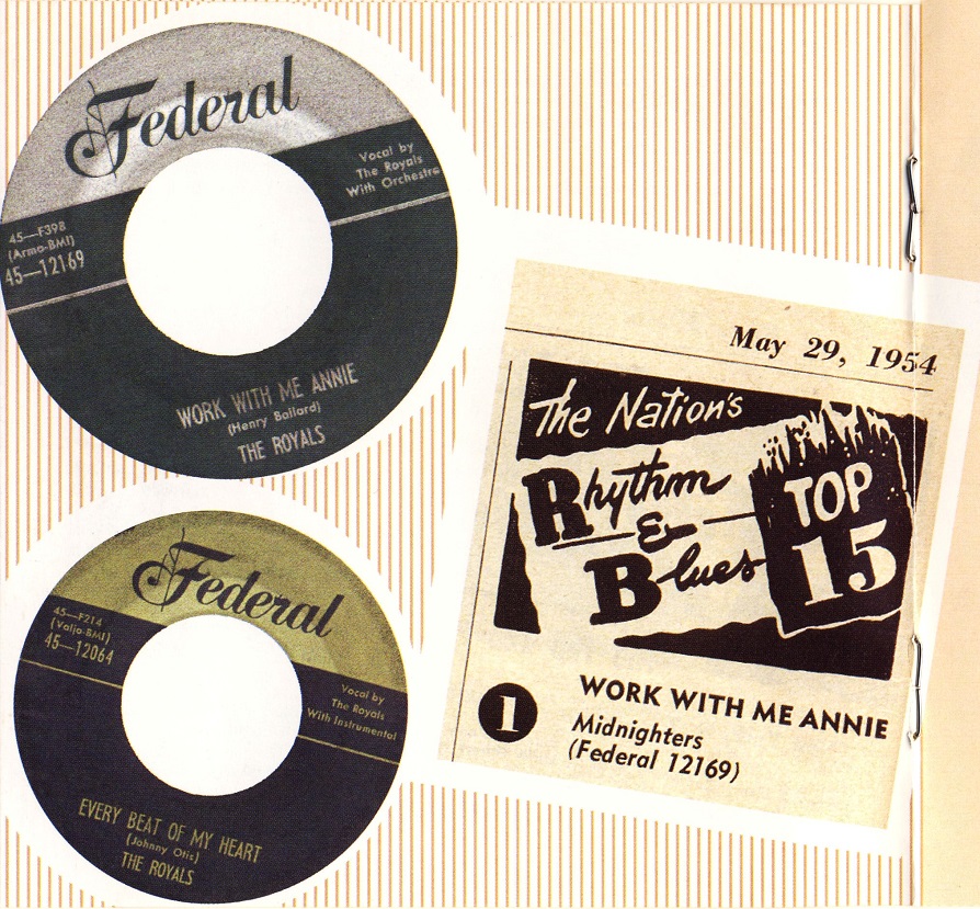 Bereits der nächste Chart-Einstieg mit dem legendären Titel “Work With Me Annie“ # 1, nachempfunden vom Royals-Hit “Get It“, erschien unter dem geänderten Namen The Midnighters (1954). Erste Pressungen im Zuge der Schallplattenfertigung sollen noch als The Royals auf Federal 12169 erfolgt sein? Weiteres siehe im Forum unter The Midnighters.