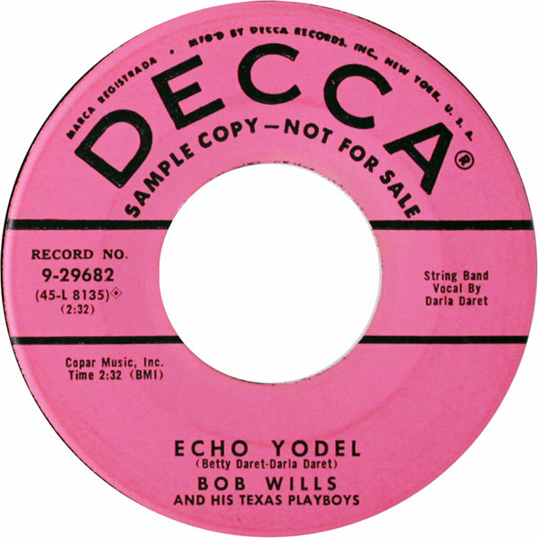 11 55....9-29682....BOB WILLS AND HIS TEXAS PLAYBOYS String Band Vocal By Darla Daret..Echo Yodel (45-L 8135)/BOB WILLS AND HIS TEXAS PLAYBOYS..New Osage Stomp (-------)