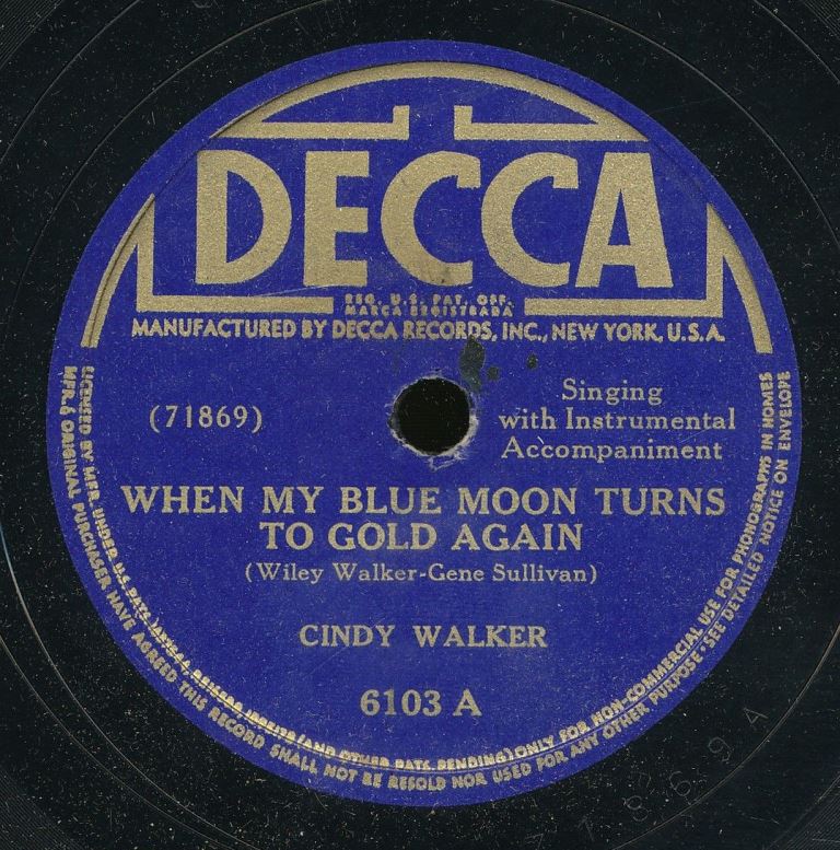Sie ist nicht in die Nashville-Szene einzuordnen, sondern eher der Musik in Texas, Kalifornien und dort besonders Hollywood. Wenig bekannt wurde, dass Cindy Walker gelegentlich selbst gesungen hat, sogar auf Schallplatte und das mit großem Erfolg! Schon 1944 stand sie als Interpretin mit dem Titel “When My Blue Moon Turns To Gold Again“ auf Decca 6103 auf # 5 der C&W-Charts – es blieb ihre einzige Notierung dort. Dieses Lied allerdings stammt von ihrem Namensvetter Wayne Walker, mit dem sie nicht verwandt war..