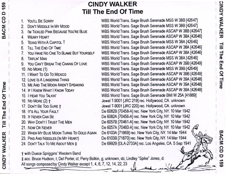 Cindy Walker, * 20. Juli 1918 in Mart/Texas unweit von Waco am Brazos River, + 23. März 2006 in Mexia/Texas, war ein Star in der amerikanischen Country-Music, betätigte sich als Sängerin und schrieb zahlreiche Hits für namhafte Countrymusic-Stars, darunter Bob Wills and the Texas Playboys (“Miss Molly“ und ca. 50 weitere Songs), Eddy Arnold (“Jim, I Wore A Tie Today“-1961), Sonny James ("Heaven Says Hello") und Cal Smith sowie für Bing Crosby (“Lone Star Trail“) oder Perry Como (“Gringos Guitar“). Bing Crosby war der erste richtige Star, der einen Walker-Titel aufnahm: “Lone Star Trail“. Damit ging ihr Stern rasch auf.