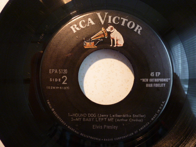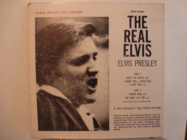 HIer nochmal die The Real Elvis US-EP, allerdings als Gold Standard Version. Gleiche Titel, fast gleiches Cover aber andere Nummer. EPA-5120. Wohl auch 1956, oder vielleicht etwas später erschienen. Hier bin ich mir nicht so sicher. Altes RCA-Victor Label und gestanzte Matrix-Nummern.