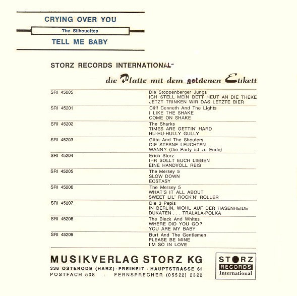 Ich suche Scans von der deutschen Gruppe The Silhouettes. Sie veröffentlichten auf Storz Records 1002 und 1005.